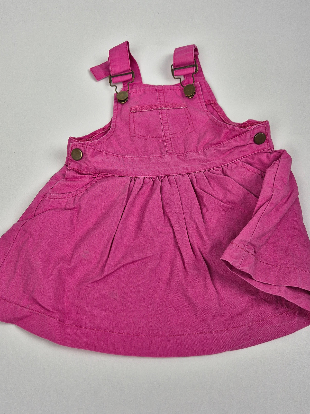 Roztomilá dívčí laclová sukně značky Pepco, velikost 86, v krásné sytě růžové barvě. Má nastavitelné ramínka, kapsičku na laclu a zapínání na knoflíky po stranách. Díky volánkovému střihu působí hravě a je ideální na léto, do školky i na rodinné oslavy.