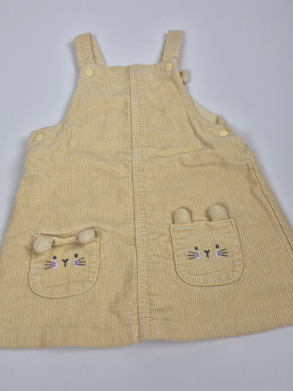 Roztomilé manšestrové laclové šaty TU v jemné světle žluté barvě. Na přední straně mají dvě kapsičky zdobené výšivkou zvířecích obličejíků s 3D oušky, což dodává šatům hravý a veselý vzhled. Praktické zapínání na ramínkách i po stranách usnadní oblékání. Příjemný měkký materiál je ideální na každodenní nošení i slavnostnější chvíle.