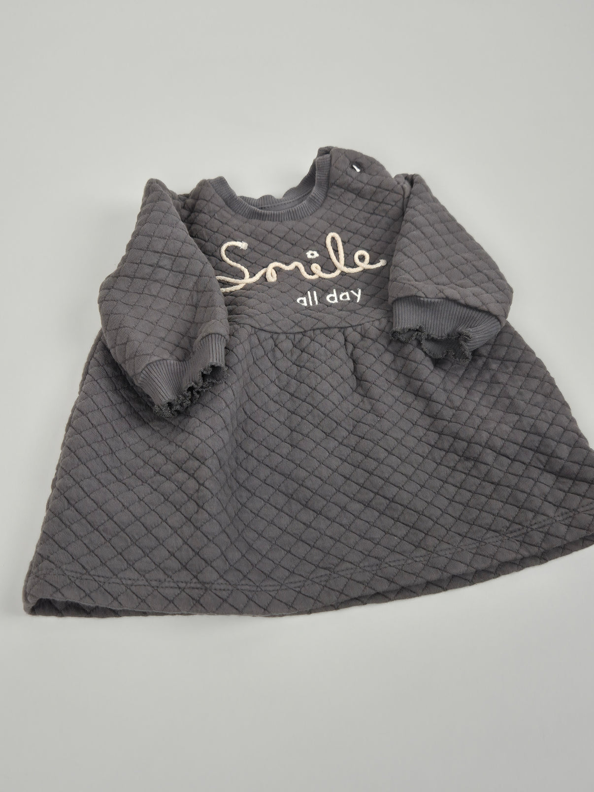 Tmavě šedé mikinošaty značky George ve velikosti 56/62. Jsou ušité z prošívaného materiálu s nápisem Smile all day vyšitém na hrudi. Mají dlouhé rukávy s žebrovanými manžetami a zapínání na rameni pro snadné oblékání. Pohodlný a stylový kousek pro holčičku na každý de
