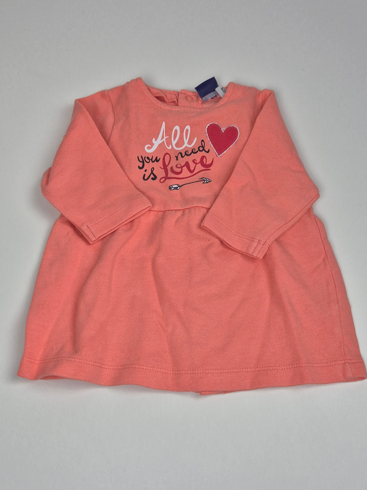 Měkoučké mikinošaty v krásném korálově růžovém odstínu, ideální pro malou parádnici. Jsou lehké, pohodlné a díky prodlouženému střihu skvěle drží teplo. Na přední straně je něžný nápis „All you need is love“ s aplikací srdíčka, který dodává hravý a sladký vzhled. Praktické zapínání na zádech usnadní oblékání. Perfektní kousek na běžné nošení do kočárku, na návštěvu i do jesliček.
