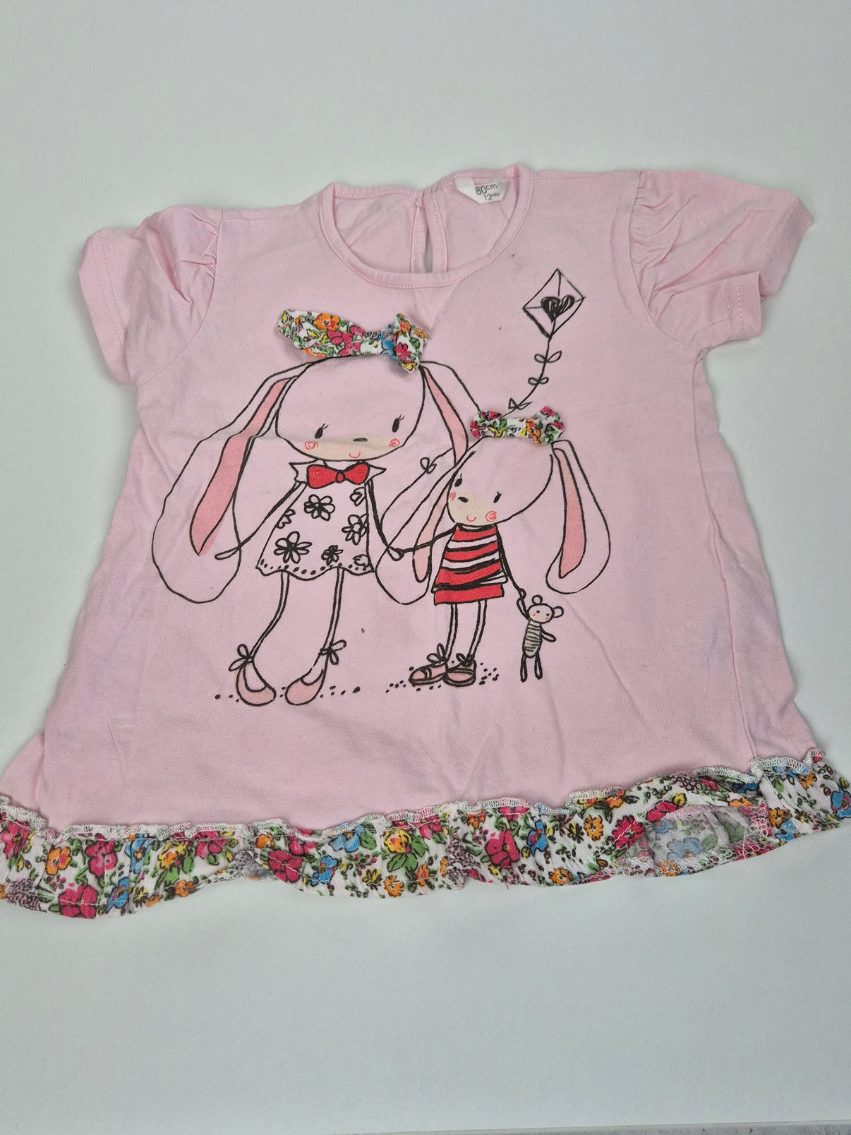 Na fotce jsou dívčí šaty bez uvedené značky ve velikosti 80. Mají světle růžovou barvu a jsou zdobené roztomilým potiskem dvou králíčků s mašličkami a drakem. Mašličky i spodní lem jsou z květovaného látkového volánku, který šatičkám dodává něžný a hravý vzhled. Materiál je lehký a příjemný, ideální na teplejší dny.