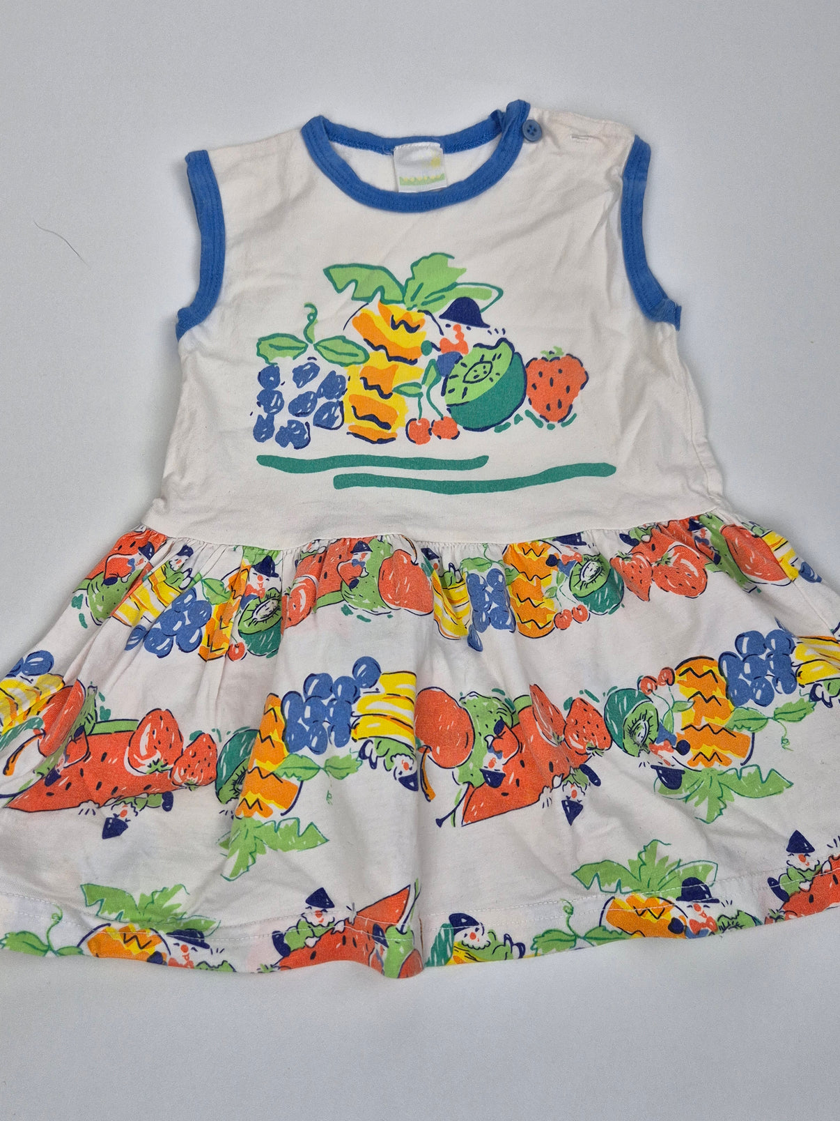Veselé letní šatičky v bílé barvě s barevným ovocným potiskem působí hravě a svěže. Horní část je zdobená potiskem ovoce, sukně má celoplošný motiv v pestrých barvách – kiwi, jahody, banány, hrozny a další. Lemování v modré barvě dodává šatičkám kontrastní akcent. Praktické zapínání na ramínku na knoflík usnadňuje oblékání. Lehký bavlněný materiál je ideální pro léto. Určeno pro holčičku.