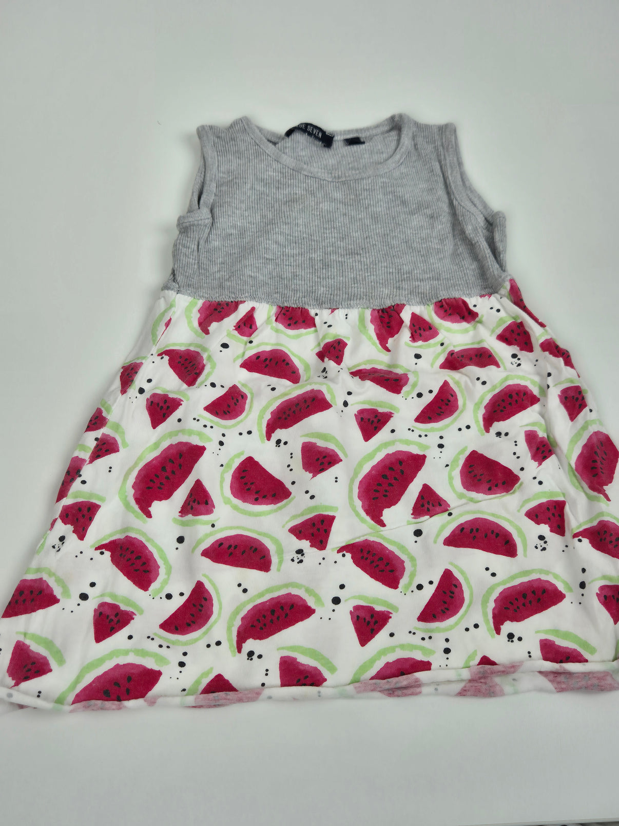 Letní šaty Blue Seven ve velikosti 98 s šedým žebrovaným živůtkem bez rukávů a sukýnkou s veselým celoplošným potiskem melounů. Lehký a pohodlný střih dělá z těchto šatů ideální volbu na léto pro malé holčičky.