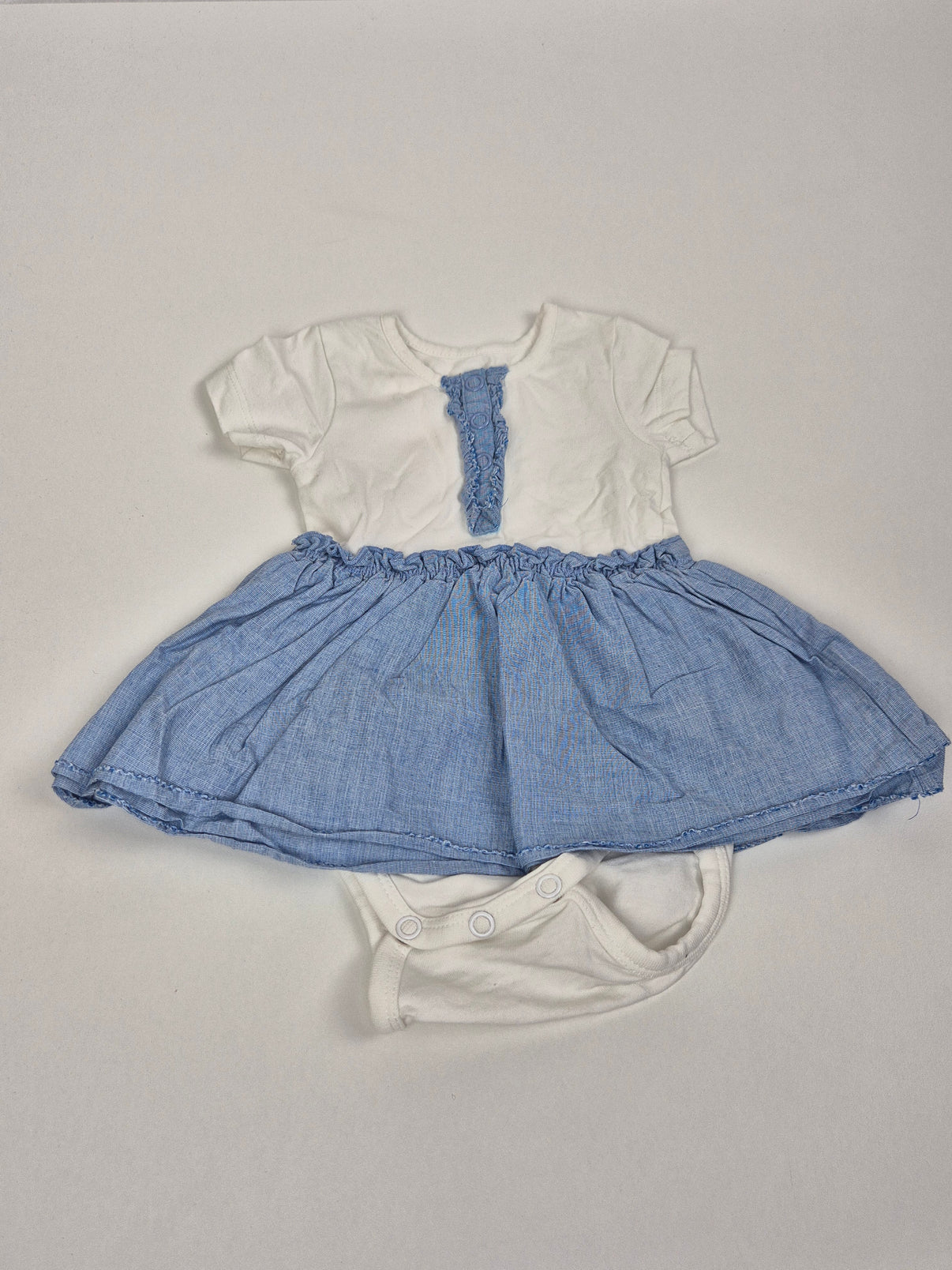 Roztomilé šaty s body značky H&M ve velikosti 56. Horní část z měkké bílé bavlny doplňuje světle modrá sukýnka s jemnou strukturou připomínající džínovinu. Na hrudi je ozdobný volánek, který dodává šatům něžný vzhled. Díky praktickému zapínání na patentky mezi nožičkami body skvěle drží a nevyhrnuje se. Ideální volba pro malé holčičky – elegantní, ale pohodlné oblečení na každý den i na slavnostní příležitost. 💫