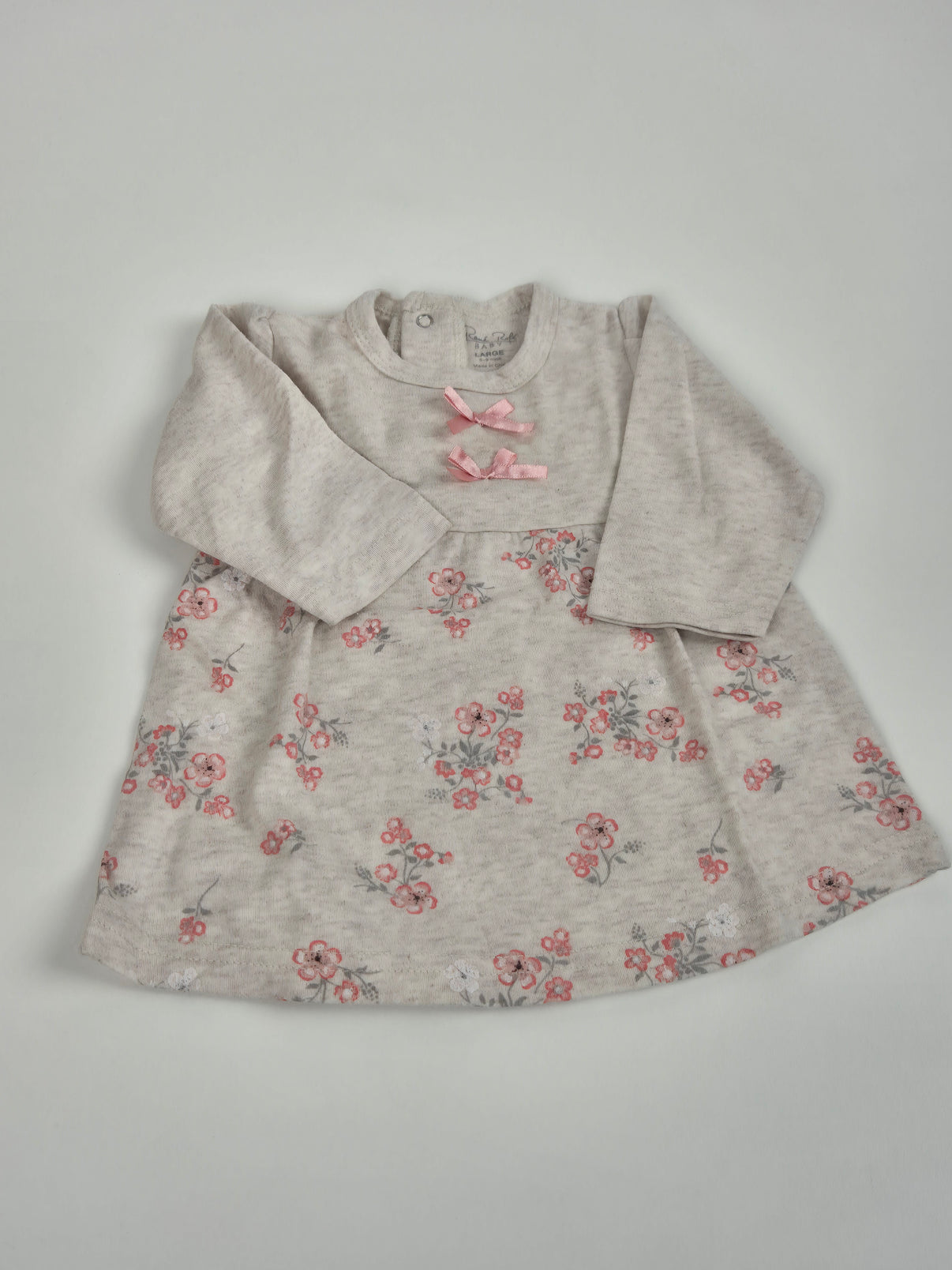 Roztomilé šaty značky Bonbebe ve velikosti 74. Jemný světle béžový základ zdobí celoplošný potisk drobných růžových kvítků, který působí něžně a hravě. Na hrudi jsou dva malé růžové saténové mašličky jako sladký detail. Šaty mají dlouhý rukáv, a proto se skvěle hodí na chladnější dny – ideální na běžné nošení i slavnostní příležitosti.