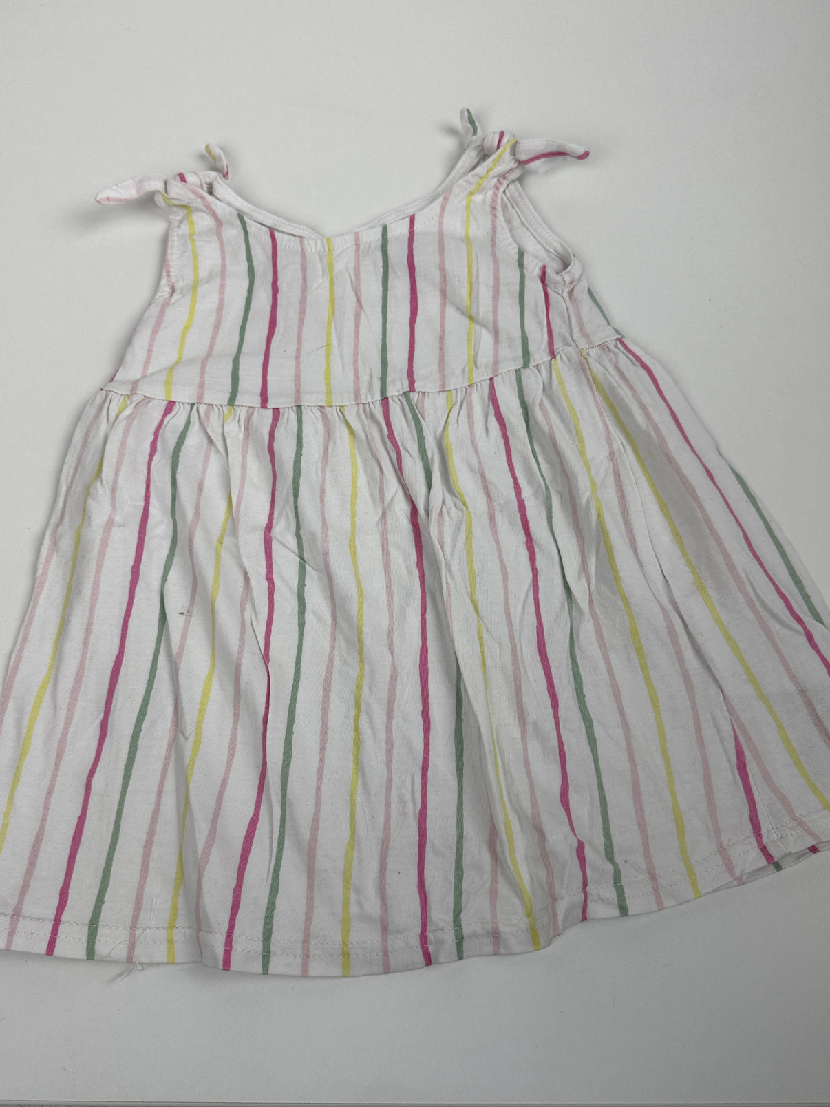 Lehké letní šatičky značky Ergee ve velikosti 86, v bílém provedení s barevnými proužky. Díky zavazovacím ramínkům se snadno přizpůsobí a lehký materiál je ideální na teplé letní dny. Krásný a vzdušný kousek pro malou holčičku.