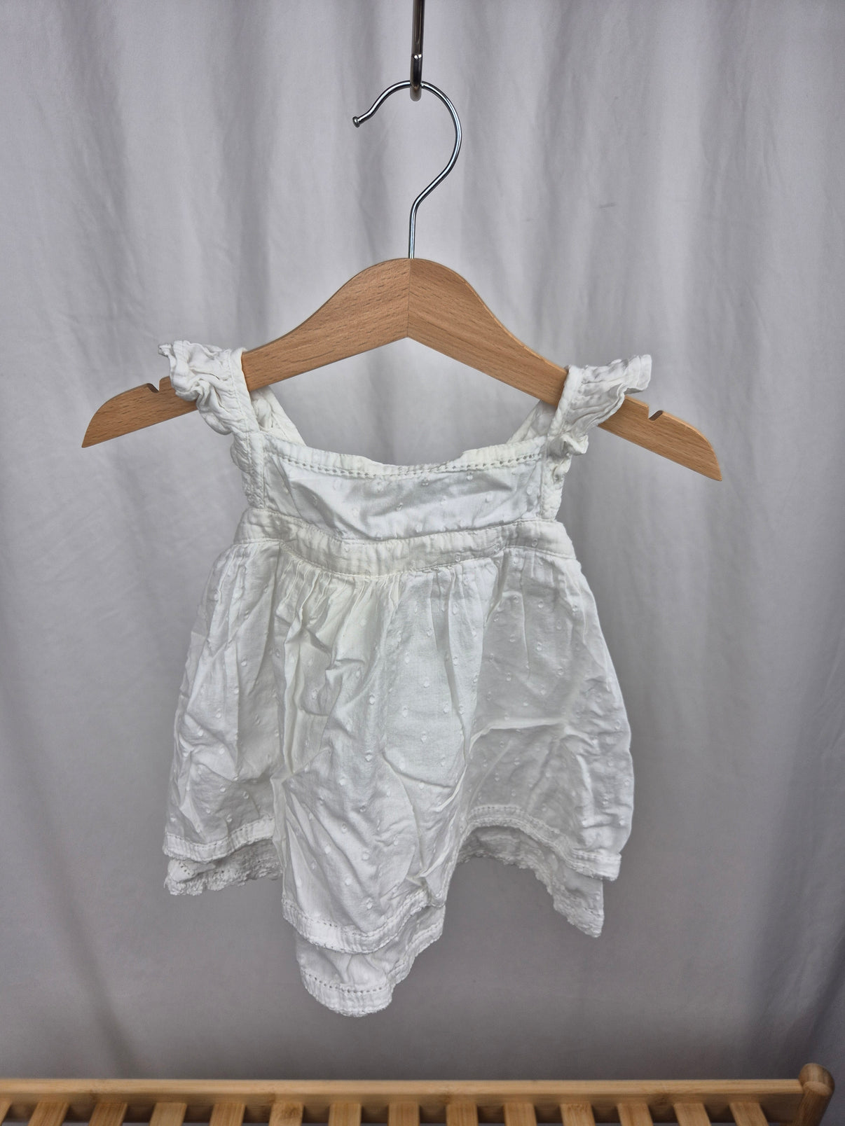 Lehoučké letní šaty značky F&F ve velikosti 68 jsou jako stvořené pro horké dny a slavnostní příležitosti miminek. Jemně krémově bílá barva s decentním puntíkovým vzorem a krajkovým lemem dodává šatům romantický a vzdušný vzhled. Nařasená ramínka s volánkem a bohatě řasená sukýnka působí něžně a pohodlně zároveň. Díky prodyšnému materiálu jsou šaty ideální na léto – ať už na slavnostní návštěvu, focení nebo jen tak na parádu. Stylový a zároveň praktický kousek pro malou princeznu.