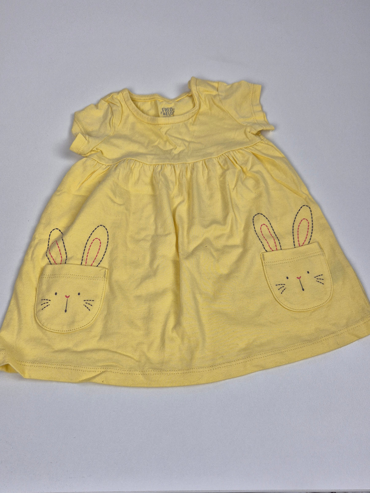 Žluté šatičky značky F&F ve velikosti 68. Krátký rukáv, příjemná bavlna a volný střih dělají z tohoto kousku ideální oblečení na teplé dny. Na kapsičkách se vyjímá roztomilý motiv zajíčků s vyšitými oušky a tvářičkami, který dodává šatičkám hravý vzhled. Skvělé pro holčičky na každodenní nošení i letní procházky. 🐰🌼