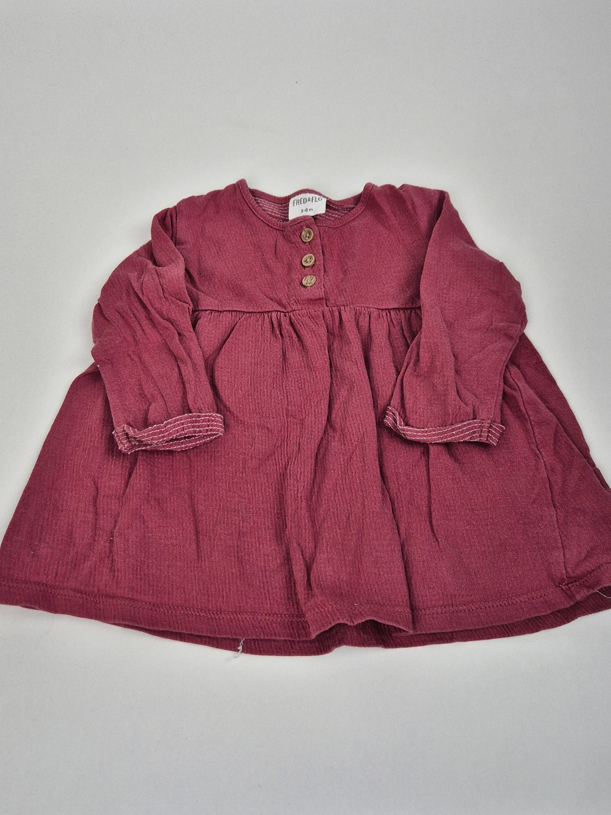 Krásné bavlněné šatičky F&F ve velikosti 68 v odstínu vínové růžové. Šaty mají volnější střih pro pohodlí při pohybu, dlouhé rukávy a drobné dřevěné knoflíčky na hrudi, které dodávají rustikální vzhled. Jsou ideální na běžné nošení i menší slavnostní příležitosti – měkký materiál zaručuje pohodlí po celý den.