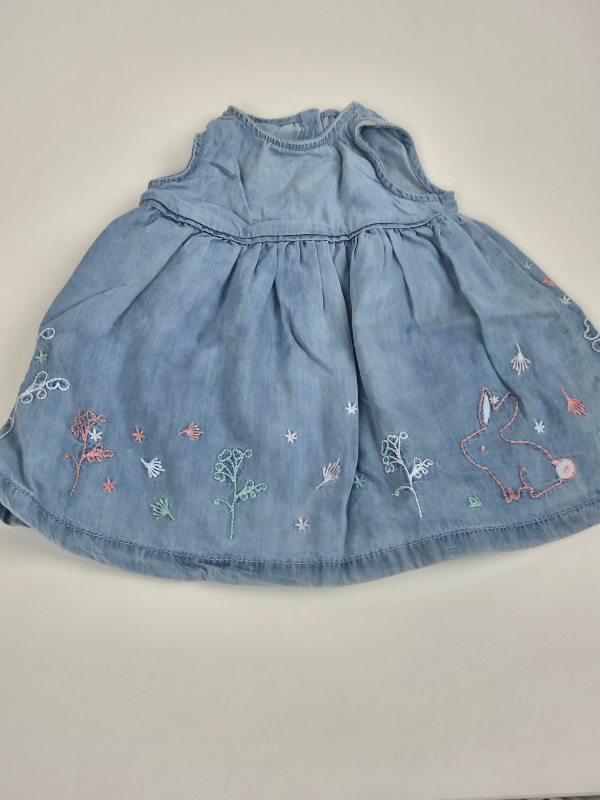 Džínové šaty F&F ve velikosti 74 mají jemný světle modrý odstín a roztomilé vyšívané motivy kytiček a králíčka ve spodní části. Díky volnějšímu střihu jsou pohodlné na nošení a hodí se jak na běžný den, tak i na svátečnější příležitosti. Krásný kousek pro malé holčičky.