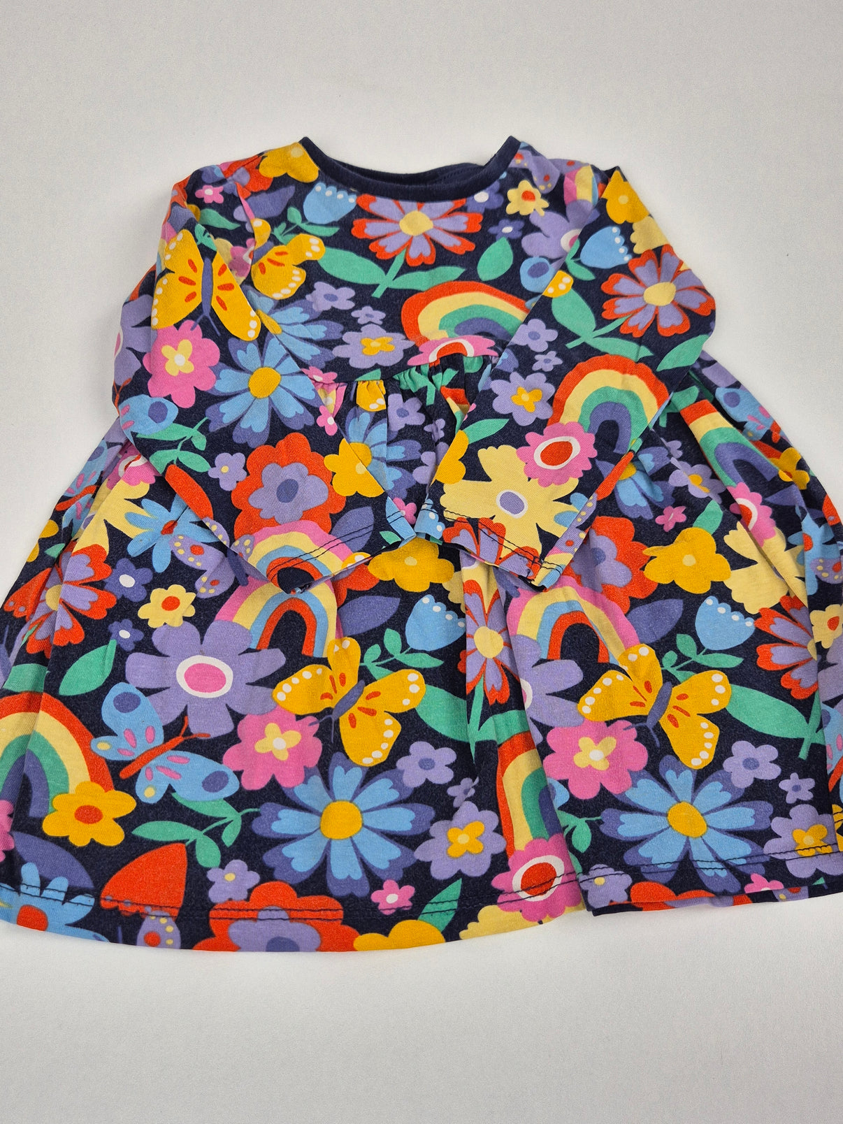Barevné dívčí šaty s dlouhým rukávem a veselým potiskem květin, duhy, motýlků a motýlů. Pohodlný střih z měkké bavlny je ideální na každodenní nošení do školky i na hraní venku. Díky výrazným barvám působí šaty hravě a rozzáří každý den.