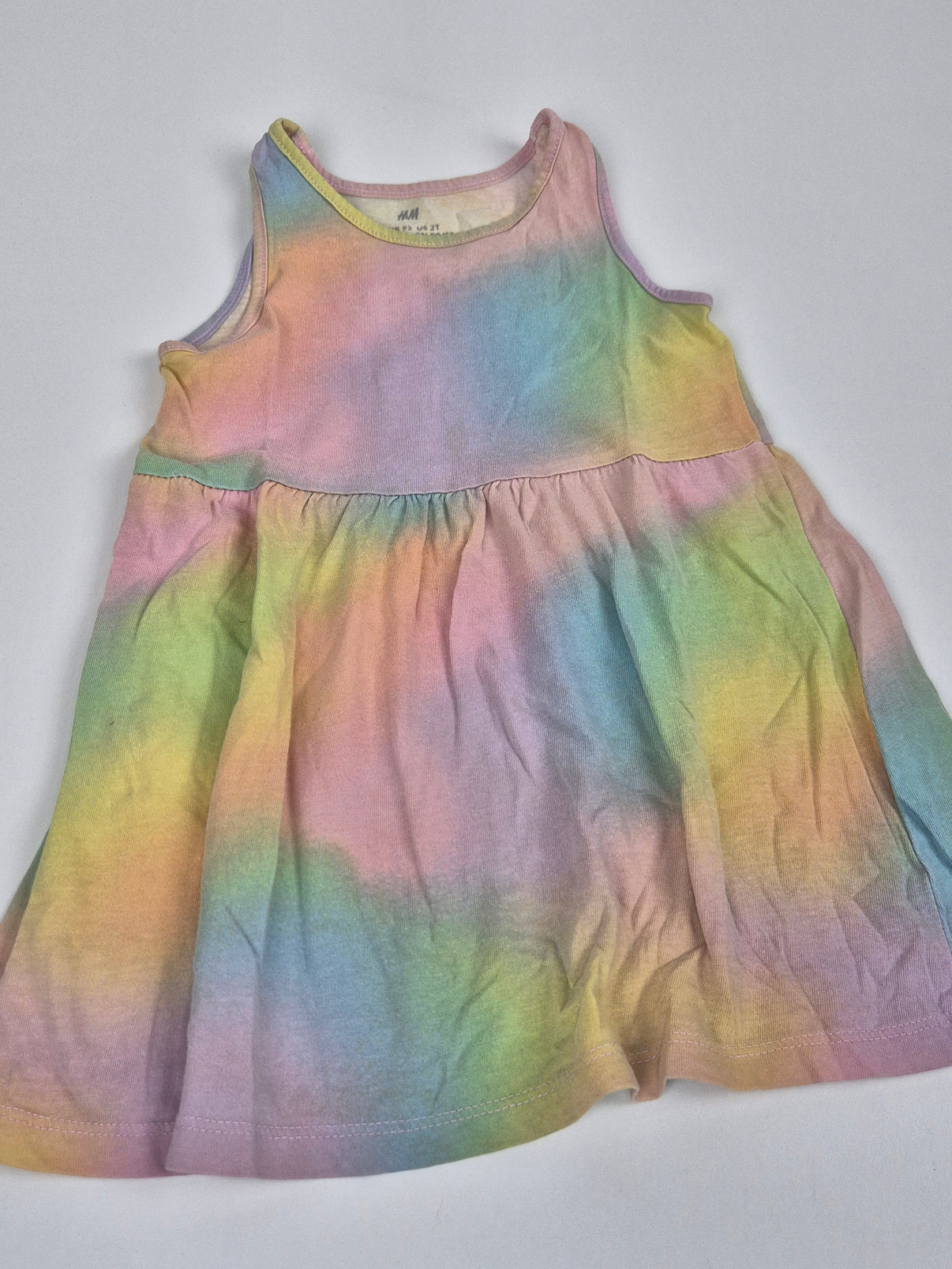 Veselé duhové šaty H&M rozzáří každý letní den! Lehký bavlněný materiál je příjemný na dotek a ideální pro teplé počasí. Pastelové přechody barev v odstínech růžové, žluté, zelené a modré vytvářejí krásný tie-dye efekt, který působí hravě a svěže. Šaty mají pohodlný volný střih s řasením v pase, díky kterému se snadno oblékají a umožňují volný pohyb. Skvělé pro malou holčičku do školky, na prázdniny nebo letní výlety. 🌈