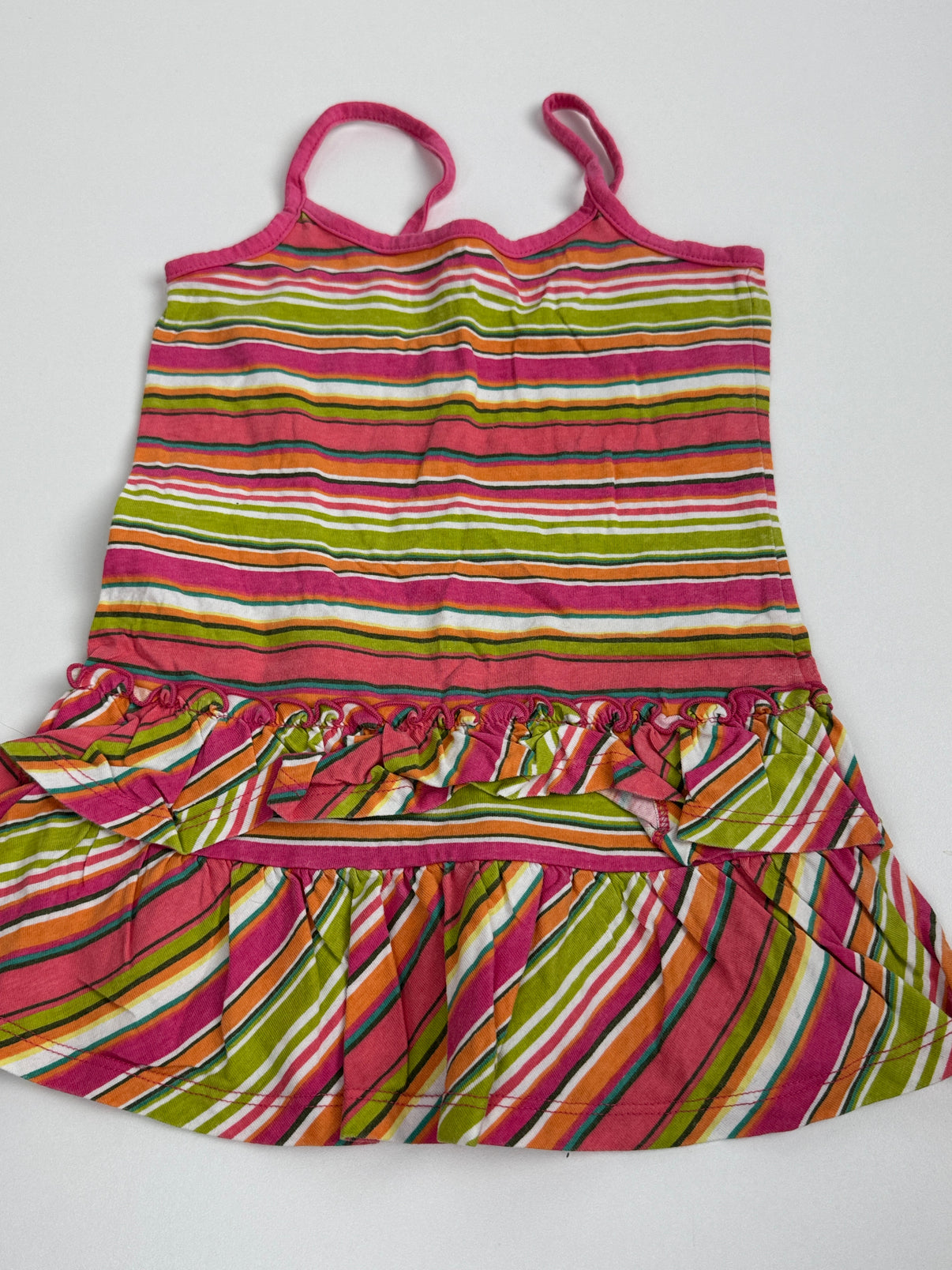 Letní šatičky Palomino (C&A) ve velikosti 92 s veselým proužkovaným vzorem v růžové, zelené a oranžové barvě. Mají tenká ramínka a volánkovou sukýnku, která dodává šatům hravý vzhled. Ideální kousek na léto, na dovolenou i do školky. Skvěle padnou malé holčičce, která má ráda barevné oblečení.