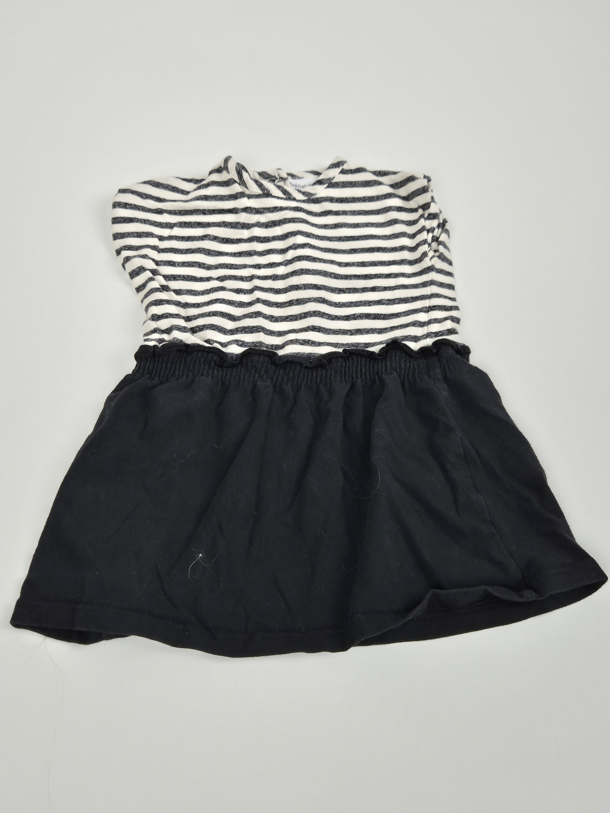 Jednoduché a pohodlné šaty značky Prénatal ve velikosti 68. Horní díl je v bílo-černém proužku, zatímco sukně je jednobarevná černá, což vytváří elegantní kontrastní vzhled. Elastický pas se přizpůsobí postavě a zajistí pohodlné nošení. Šaty se hodí na běžné nošení i na slavnostnější příležitosti, kdy malá slečna zazáří.