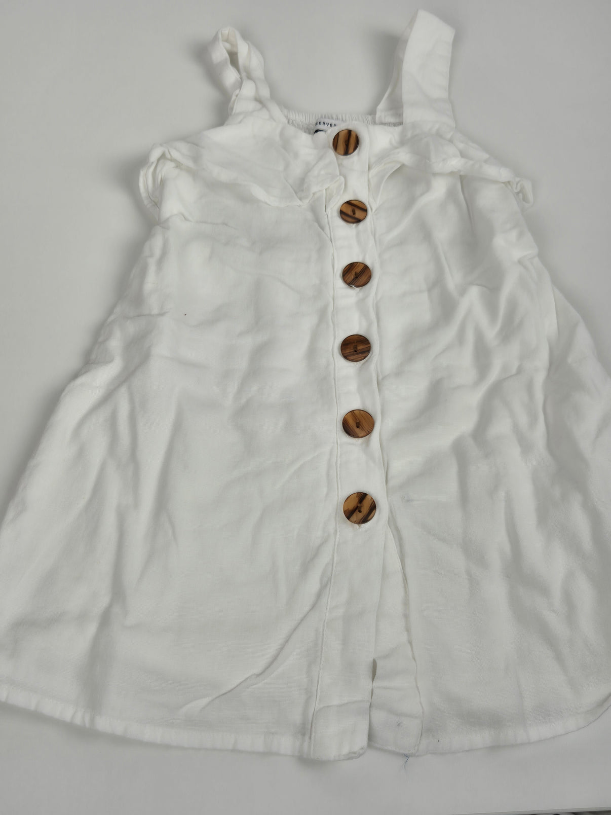 Letní šaty Reserved ve velikosti 104 v čistě bílé barvě na tenká ramínka. Přední část zdobí velké dřevěné knoflíky, které dodávají elegantní vzhled. Lehký a vzdušný materiál je ideální pro horké letní dny.