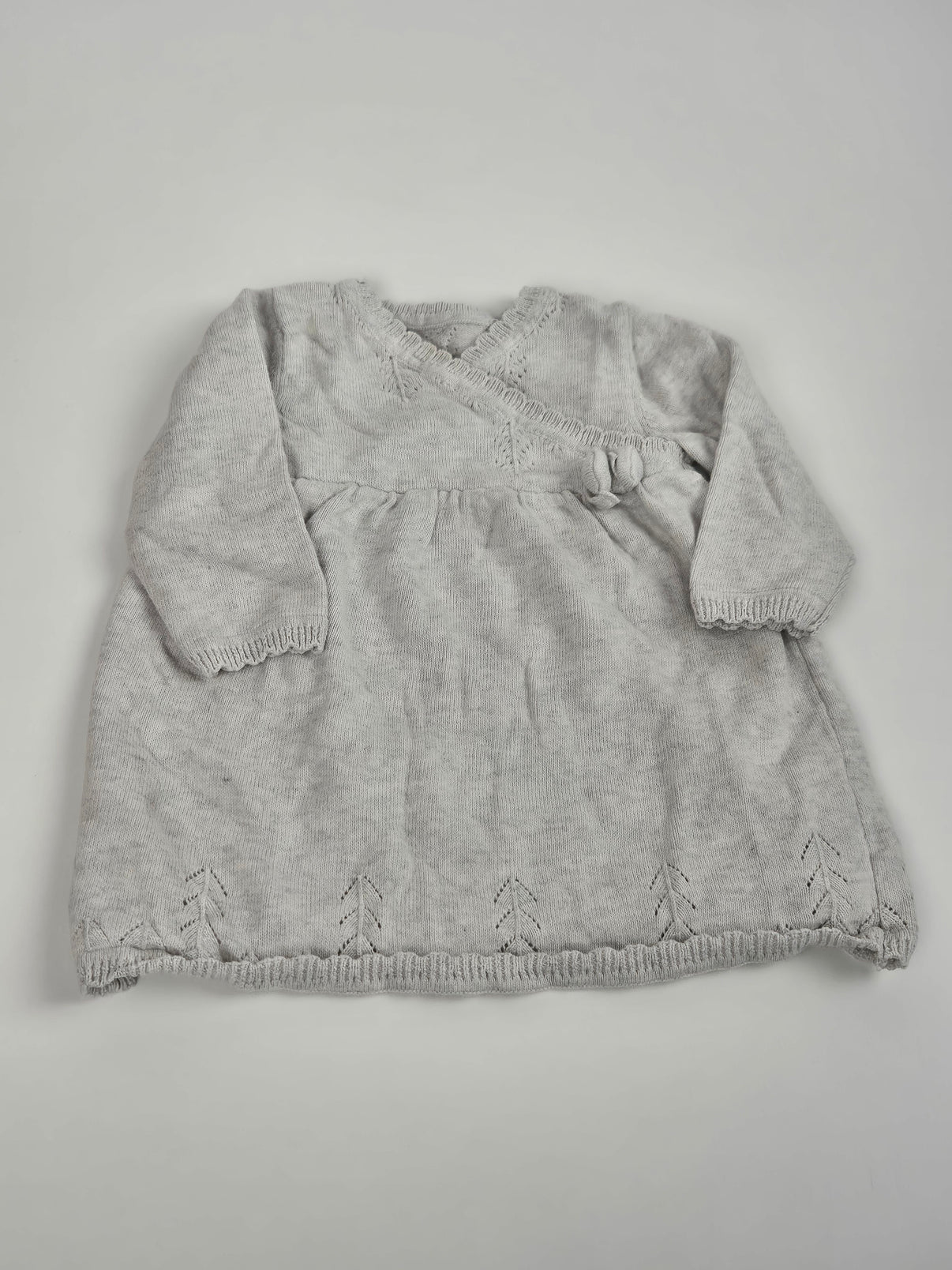 Pletené šaty značky Tu ve světle šedé barvě, velikost 62/68. Mají dlouhý rukáv a zavinovací efekt s ozdobnou mašličkou. Spodní lem je zdoben jemným vzorem ve tvaru šipek. Elegantní, ale přitom pohodlný kousek pro holčičku, ideální na návštěvy i slavnostnější příležitosti.
