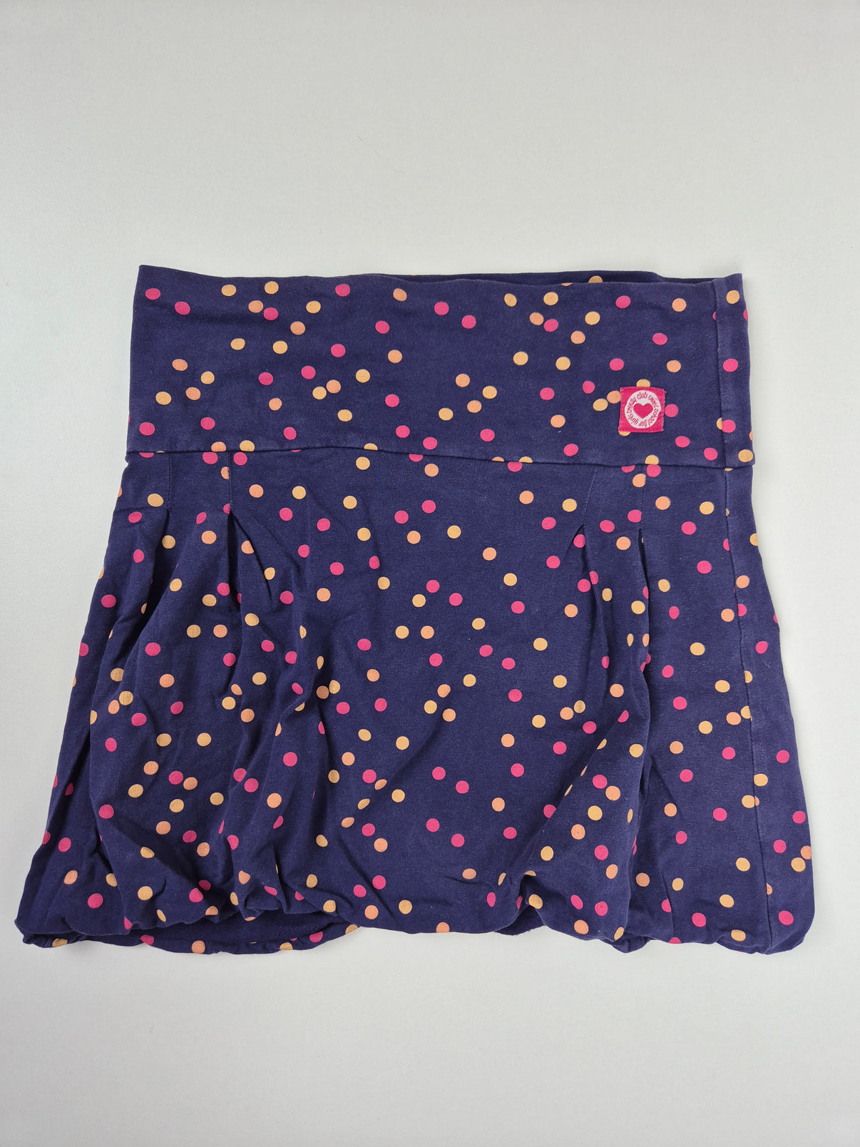 Stylová dívčí sukně Lewro v tmavě modré barvě s barevným puntíkovaným vzorem v odstínech růžové a oranžové. Má pohodlný široký pas bez zapínání a volnější balónový střih, který zajišťuje pohodlí při pohybu. Ideální na běžné nošení i volný čas.