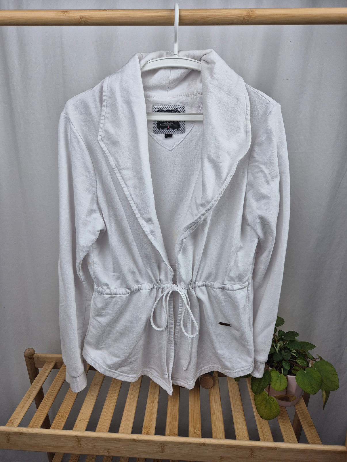 Lehká bílá mikina od značky Kixmi je ideální volbou pro pohodlí během těhotenství i po něm. Díky volnějšímu střihu a stahování v pase se skvěle přizpůsobí měnící se postavě a poskytne příjemné nošení po celý den. Mikina má elegantní šálový límec, kapsy a decentní logo značky na spodní části. Perfektní na procházky, do města i na domácí pohodu. Velikost XL.