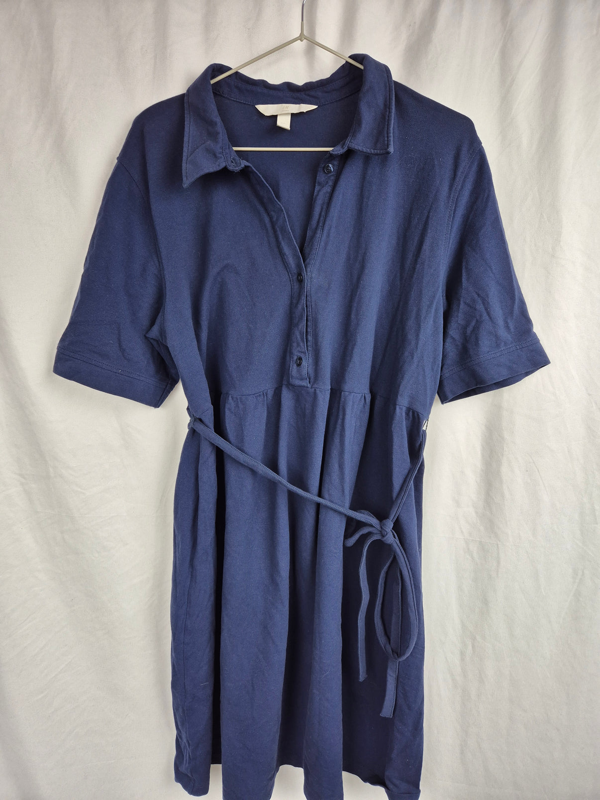 Tmavě modré těhotenské a kojicí košilové šaty značky H&M s krátkým rukávem a páskem na zavázání v pase. Díky košilovému střihu s knoflíčky jsou praktické i pro kojení a zaručují pohodlí v těhotenství i po něm. Skvělá volba na volný čas i do práce.