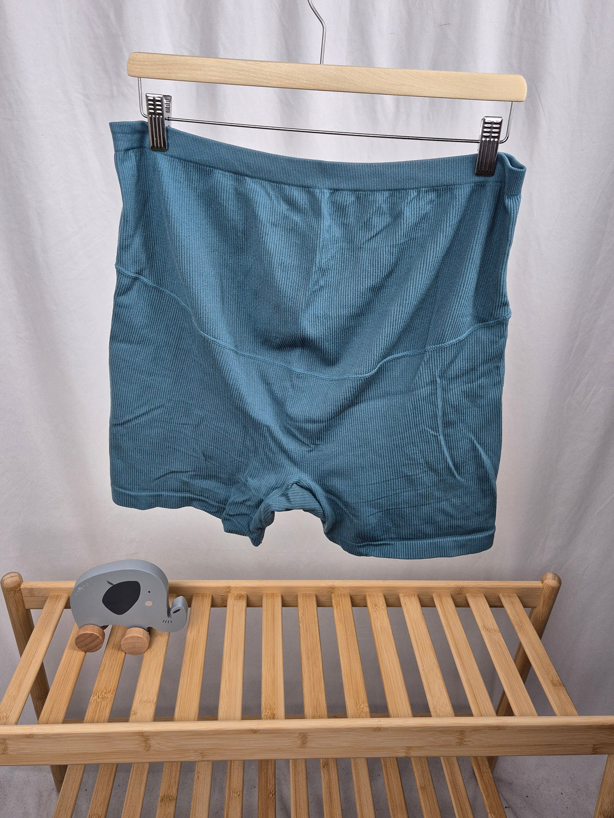 Těhotenské kraťasy značky Rezervované veL jsou ušité z pohodlného pružného materiálu, který se přizpůsobí rostoucímu bříšku. Mají vysoký žebrovaný pas bez zapínání, takže nikde netlačí a jsou ideální na doma i na volný čas během teplejších dnů. Jednoduchý střih a univerzální modro-zelená barva se snadno kombinuje s dalšími kousky v šatníku. Praktický a pohodlný doplněk pro nastávající maminky.
