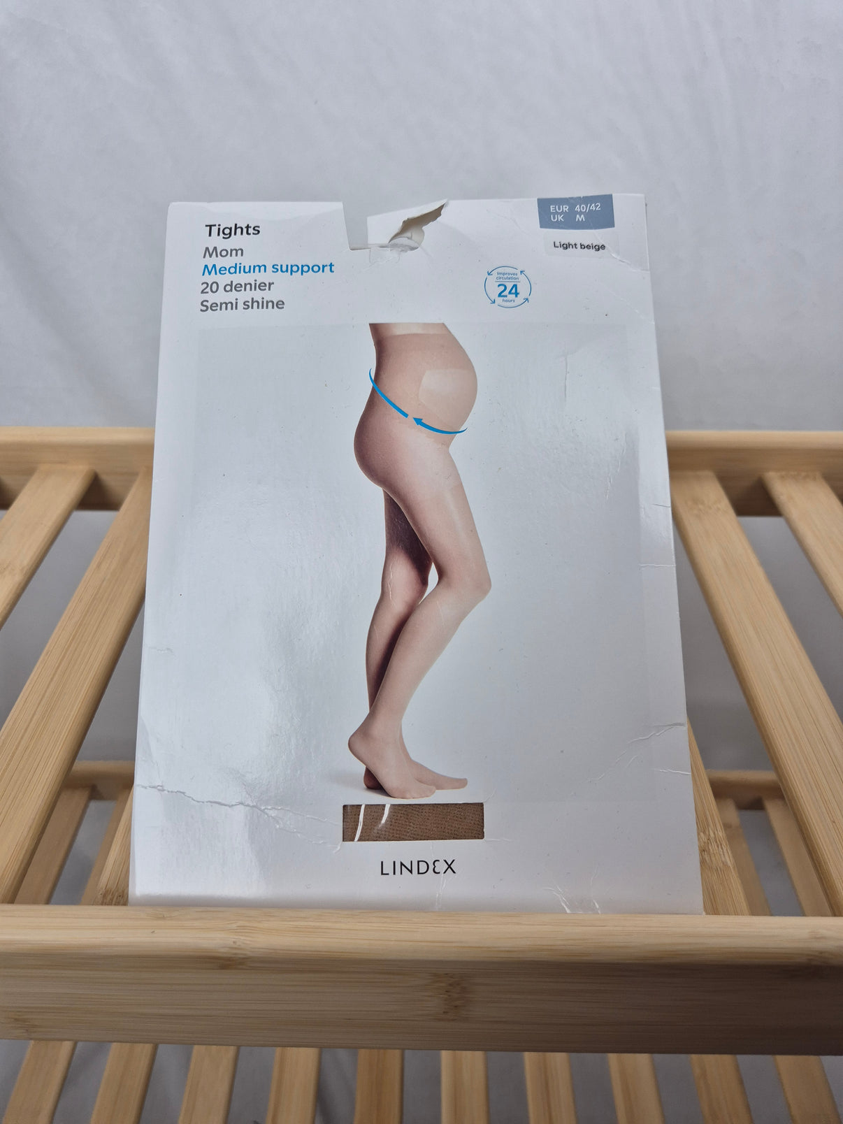 Těhotenské punčocháče značky Lindex ve velikosti 40/42 (M) v odstínu světle béžové. Mají pololesklý vzhled, střední podporu bříška a zesílenou špičku pro pohodlné každodenní nošení.