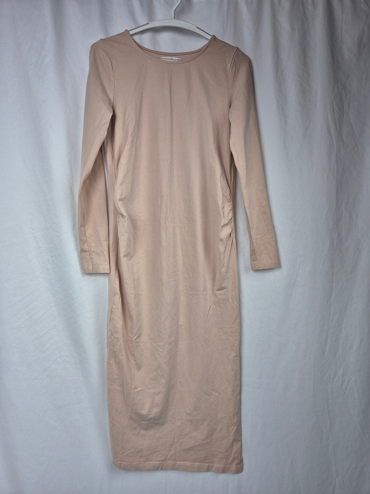 Jednoduché a pohodlné těhotenské šaty v béžové barvě s dlouhým rukávem, ideální na každodenní nošení. Díky elastickému materiálu a jemnému řasení po stranách se krásně přizpůsobí rostoucímu bříšku a zajistí pohodlí během celého dne. Midi délka působí elegantně a zároveň prakticky. Značka Sinsay, velikost L.