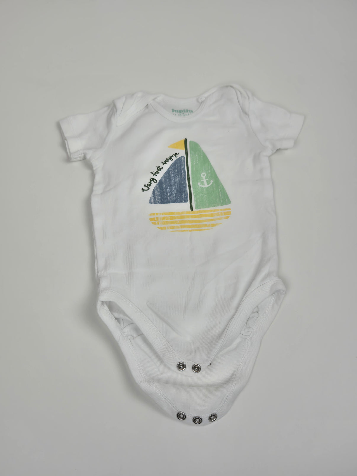 Roztomilé bílé body Lupilu s krátkým rukávem a barevným potiskem plachetnice – ideální kousek na léto i dovolenou. Veselá kombinace modré, zelené a žluté dodává body hravý námořnický nádech. Praktické zapínání na patentky mezi nohavičkami usnadní přebalování a pohodlný střih zajistí miminku volnost pohybu. Příjemná bavlna je skvělá na celodenní nošení.