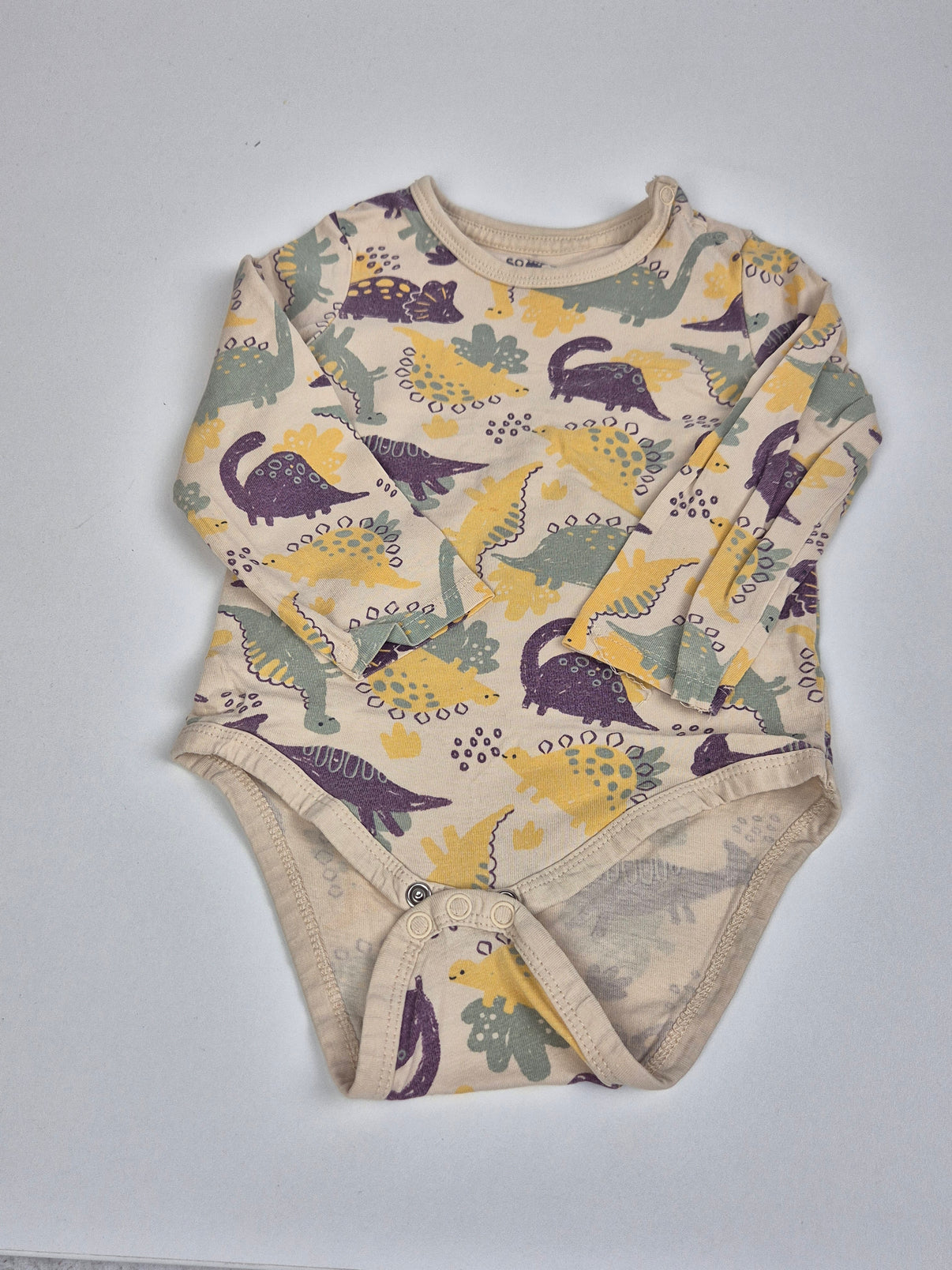 Roztomilé body Pepco s dlouhým rukávem, vyrobené z měkké bavlny. Krémový základ s potiskem barevných dinosaurů v odstínech žluté, fialové a zelené dává body hravý vzhled. Praktické zapínání na patentky mezi nožičkami a na rameni umožňuje snadné oblékání.