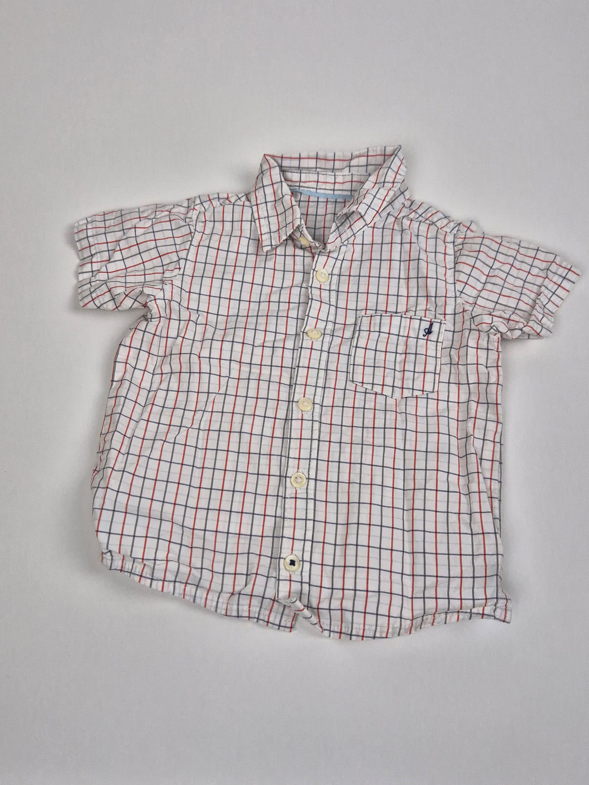 Lehká bavlněná košile značky Marks & Spencer s krátkým rukávem v bílé barvě s jemnou červenou a modrou kostkou. Košile má klasický límeček, zapínání na knoflíky po celé délce a...