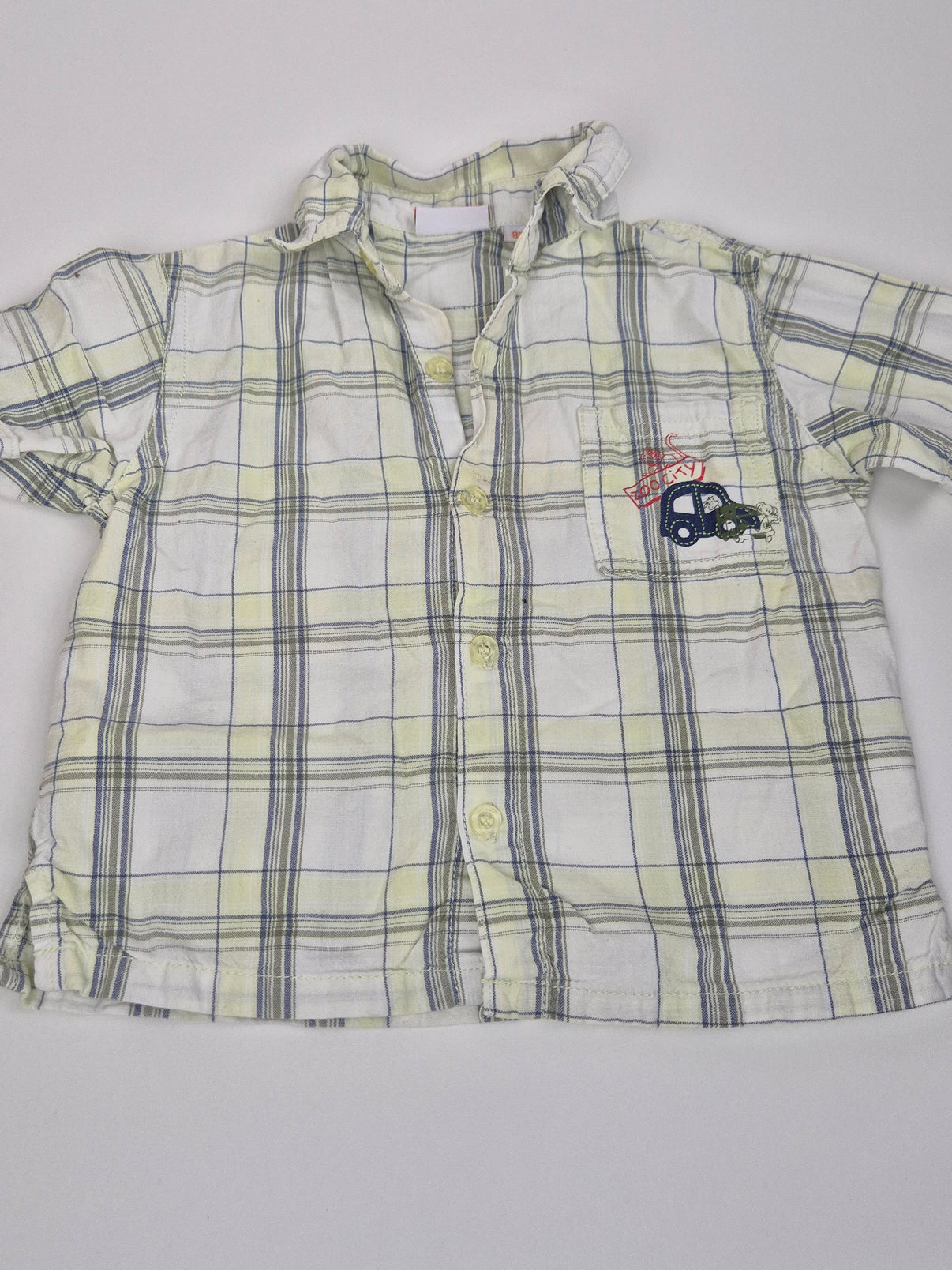 krátké rukávy, světlý kostkovaný vzor v odstínech bílé, žluté a šedé, a je oživená výšivkou autíčka na hrudi i na zádech s nápisem “Zoo City”.