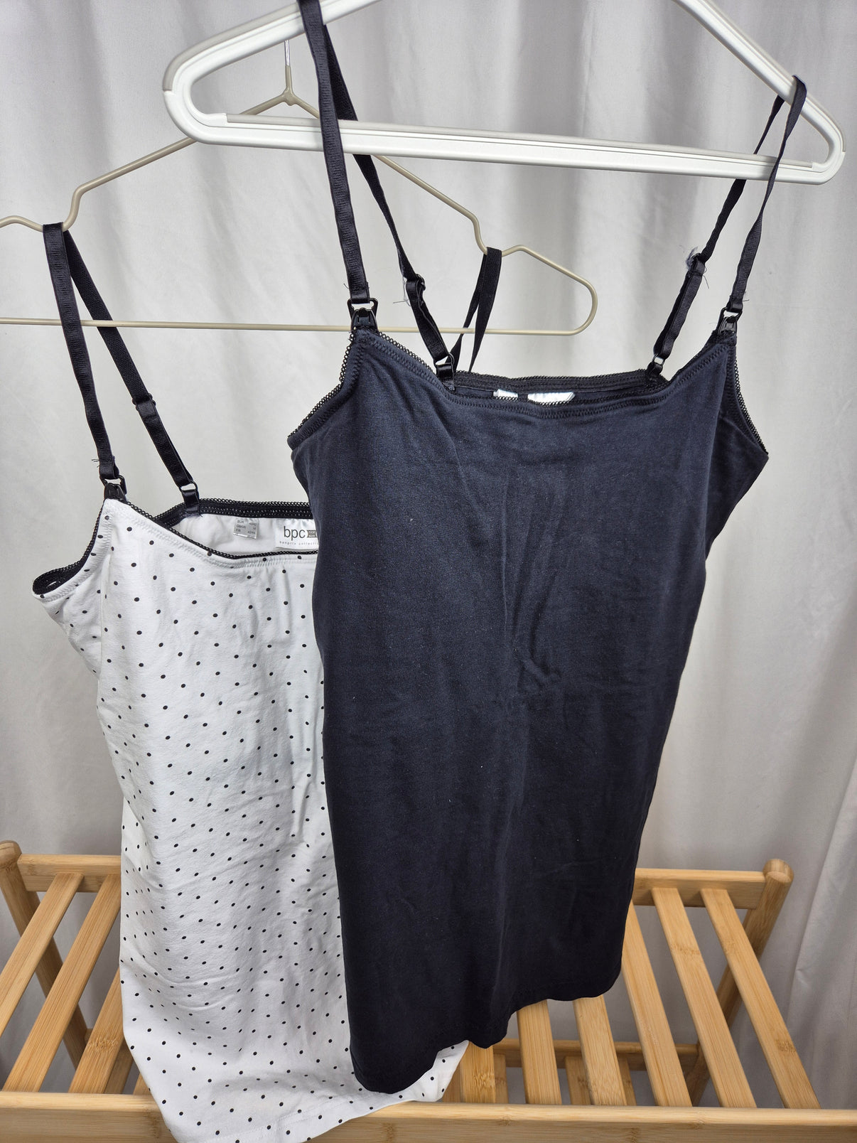 Sada dvou těhotenských a kojících tílek Bonprix ve velikosti 40/42 – univerzální, pohodlné a ideální pro každodenní používání. Černé tílko je nadčasové a snadno kombinovatelné, bílé puntíkované působí jemně a hravě. Obě mají odepínací ramínka, která umožňují rychlé a diskrétní kojení, a díky příjemně pružnému bavlněnému materiálu se krásně přizpůsobí jak rostoucímu bříšku, tak období po porodu.