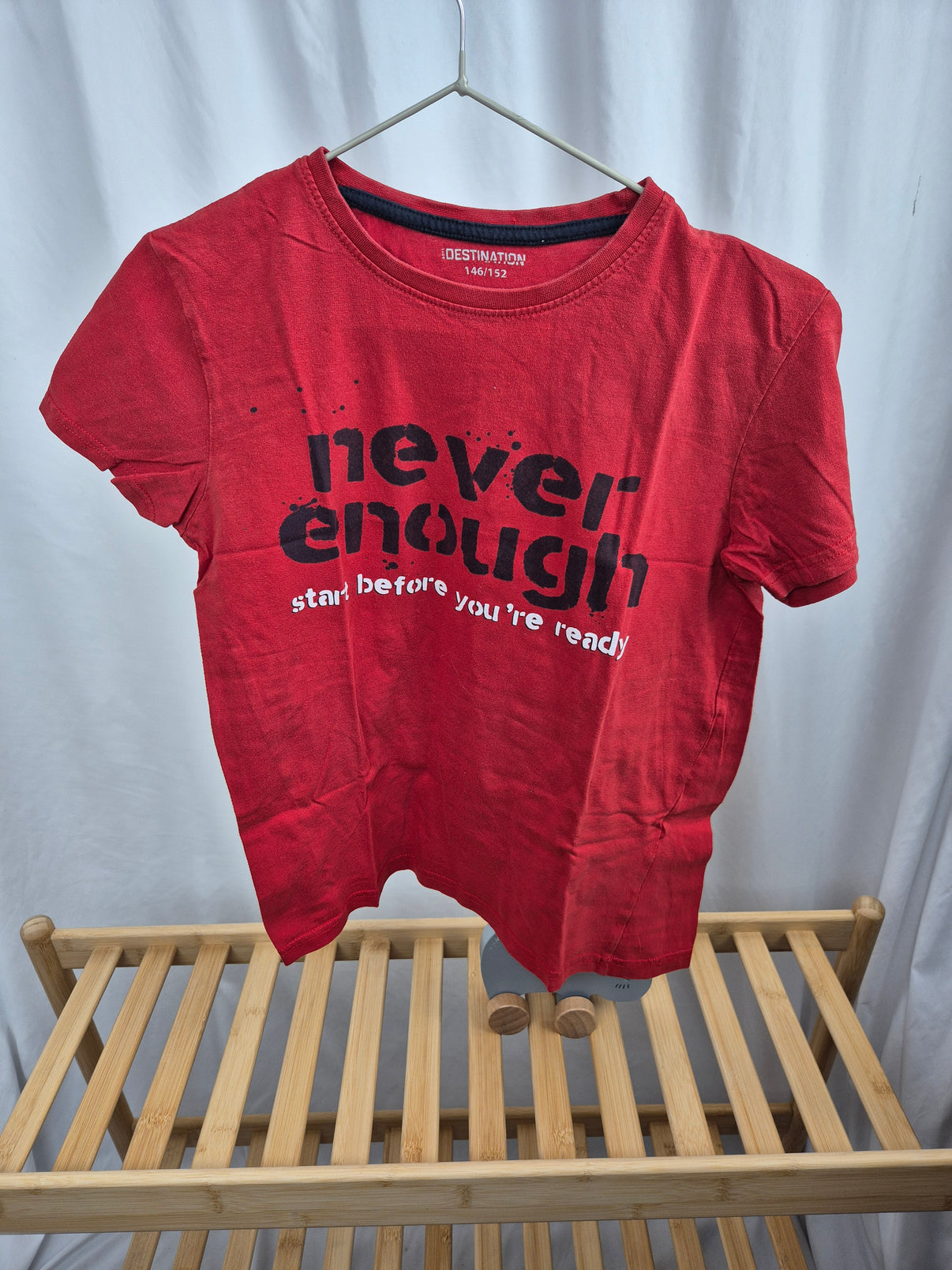Sytě červené tričko Destination s krátkým rukávem, které okamžitě zaujme výrazným černobílým potiskem „never enough – start before you're ready“. Stylový, lehce streetový vzhled dělá z tohohle kousku perfektní volbu pro starší kluky, kteří mají rádi výraznější módu. Bavlněný úplet je pohodlný na celodenní nošení – do školy, na volnočasové aktivity i jen tak ven s kamarády.
