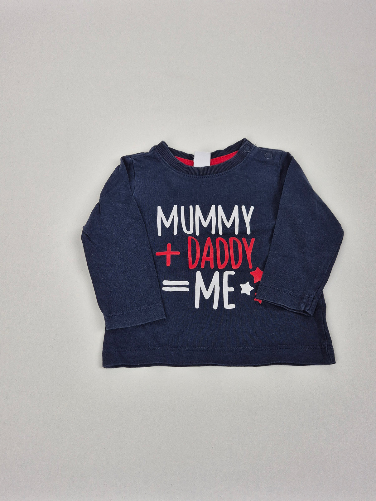 Roztomilé bavlněné tričko Dopodopo ve velikosti 56. Tmavě modré provedení s potiskem „Mummy + Daddy = Me“ se hodí pro chlapečky i holčičky. Praktické zapínání na rameni a příjemný materiál zajistí pohodlí po celý den.