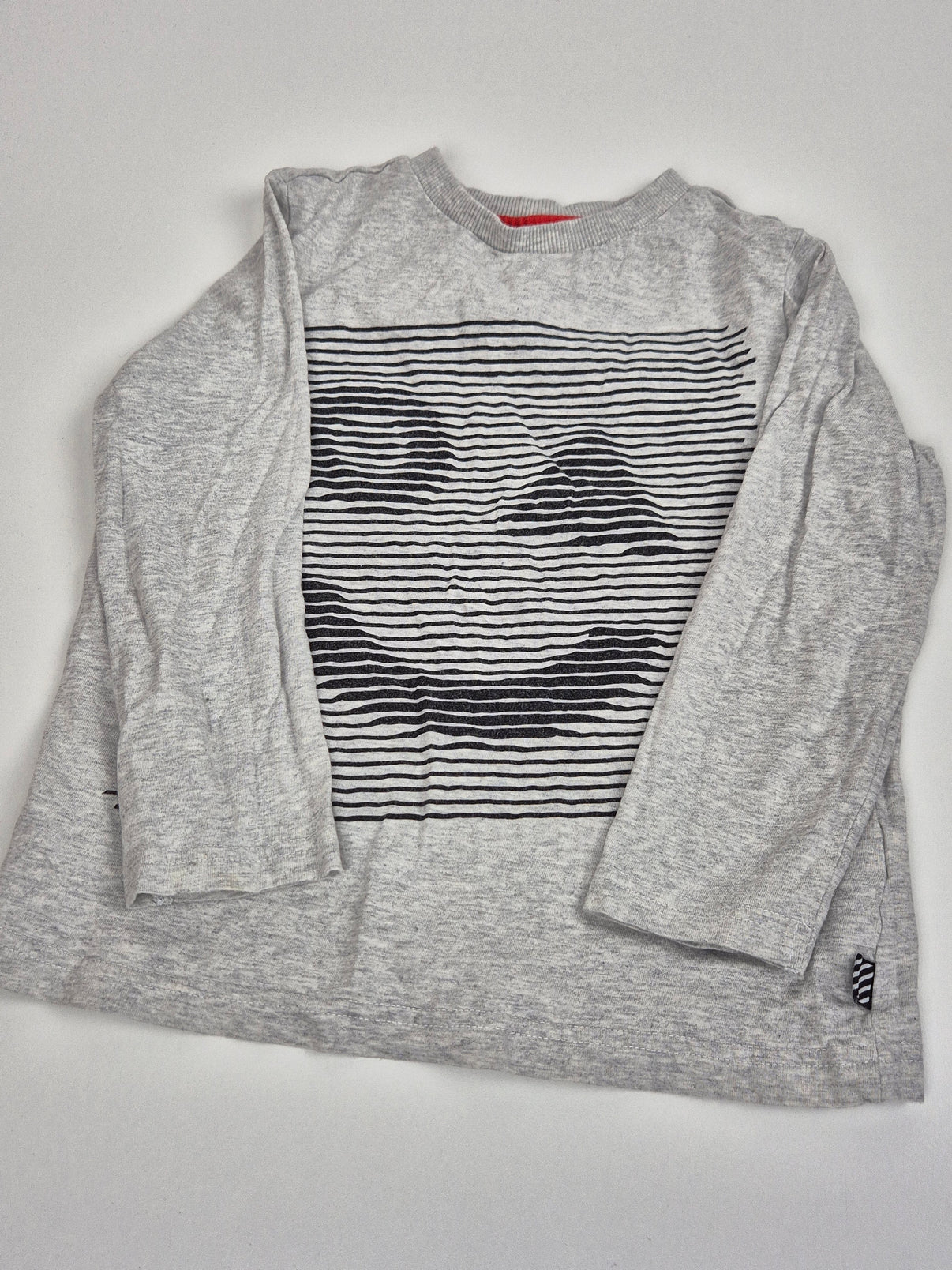 Stylové dětské tričko značky F&F v světle šedé barvě s vtipným potiskem usměvavé tváře tvořené tenkými pruhy. Vyrobené z měkké a příjemné bavlny, vhodné pro každodenní nošení. Skvěle se hodí do školy, školky i na volný čas. Dlouhý rukáv zaručí pohodlí i v chladnějších dnech. Ideální kousek pro kluka, který má rád pohodlí a hravé motivy.