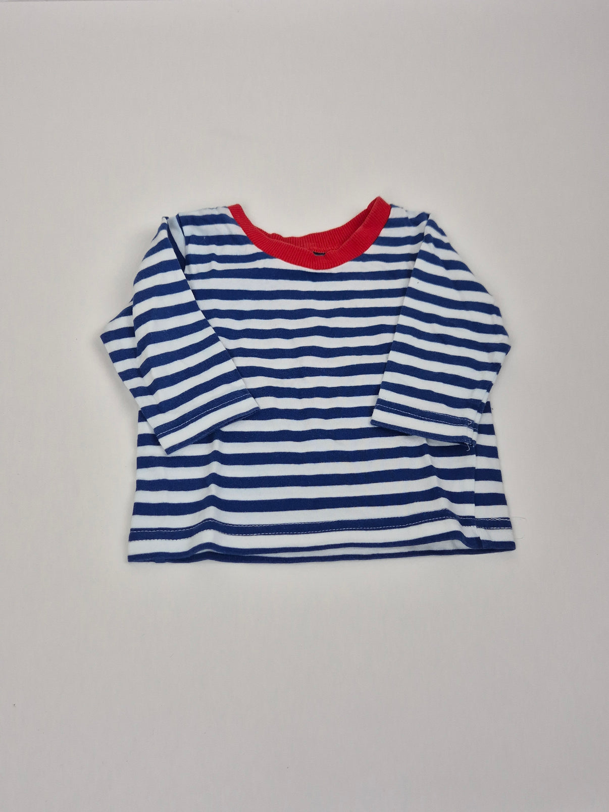 Roztomilé tričko značky George ve velikosti 56/62 v námořnickém stylu – s modro-bílými proužky a kontrastním červeným lemem u krku. Vyrobené z měkké a prodyšné bavlny, která je šetrná k dětské pokožce. Díky dlouhým rukávům je ideální na chladnější dny. Stylový základní kousek pro malé chlapečky, který se skvěle kombinuje s džínami nebo tepláčky. 🚤