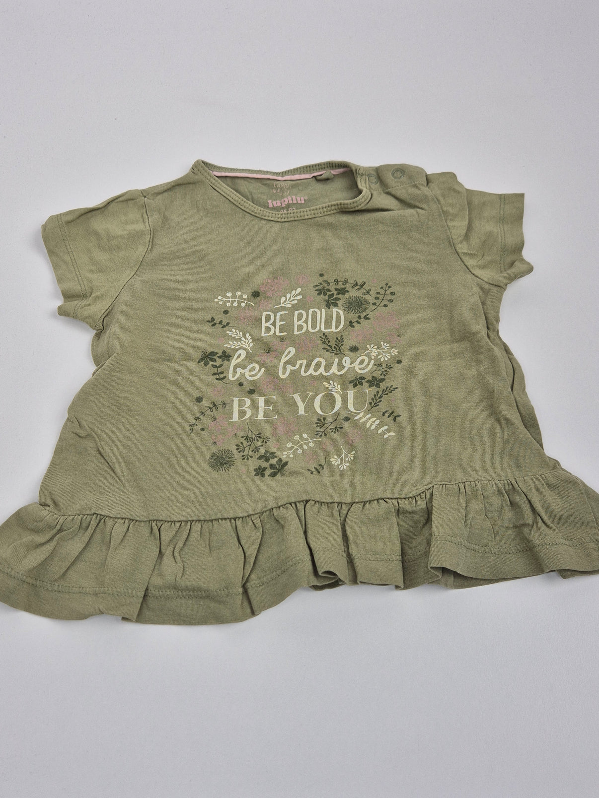 Khaki tričko Lupilu s krátkým rukávem a roztomilým volánkovým lemem, který mu dodává šatový vzhled. Přední stranu zdobí jemný květinový potisk s nápisem Be bold, be brave, be you – krásné poselství pro malou slečnu. Pohodlný bavlněný materiál je ideální na běžné nošení i do školky. Zapínání na ramínku usnadňuje oblékání.