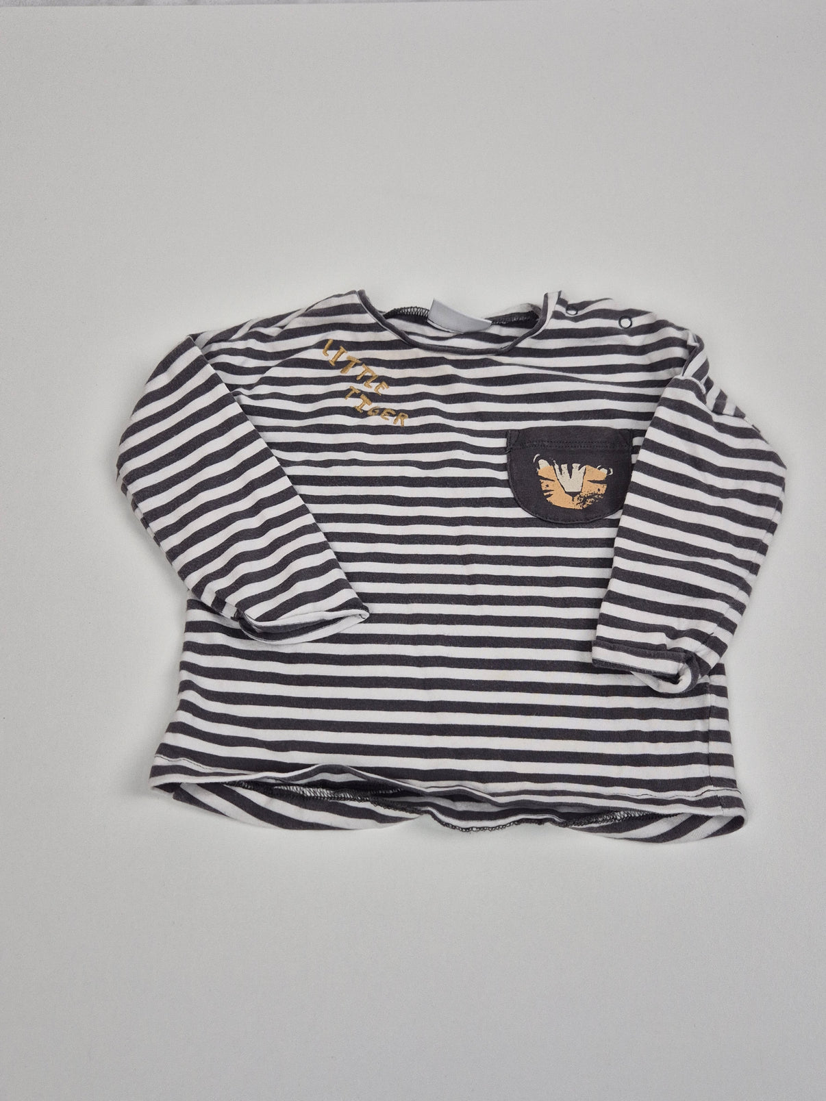 Roztomilé dětské tričko značky Next v černo-bílém pruhovaném provedení s kapsičkou a zlatým nápisem „Little Tiger“. Vyrobené z měkké bavlny, která je příjemná k pokožce a vhodná i pro citlivé děti. Tričko má dlouhý rukáv a praktické zapínání na ramínku, které usnadňuje oblékání. Ideální na běžné nošení, do školky i na doma. Skvělý kousek pro malého chlapečka, který má rád zvířátka.