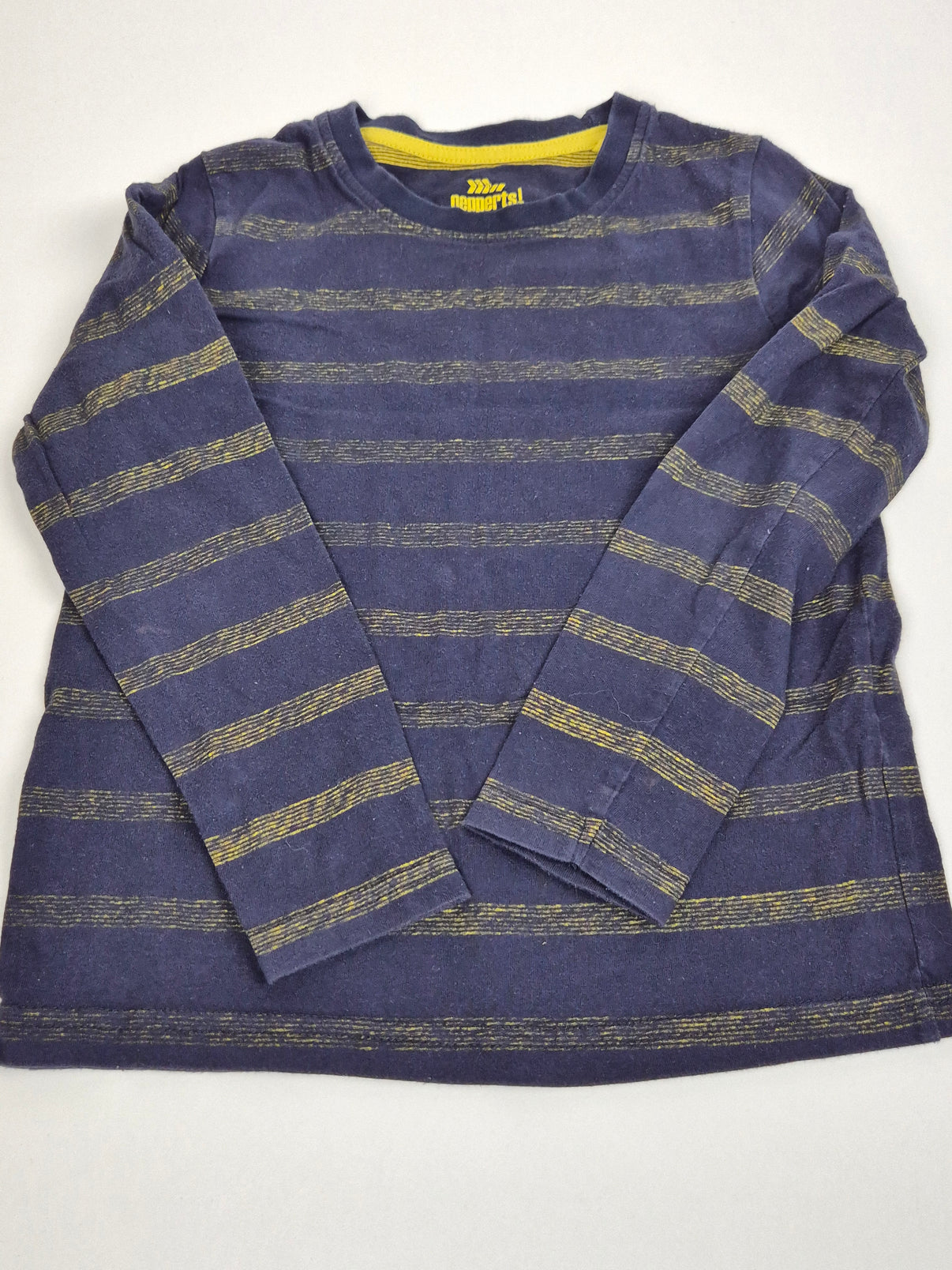 Modré chlapecké tričko Pepperts! s dlouhým rukávem a žlutým proužkem. Vyrobené z pohodlné bavlny, která je příjemná na dotek a vhodná pro každodenní nošení. Klasický střih s kulatým výstřihem, decentní proužkovaný vzor a žluté detaily v krku dodávají tričku sportovní vzhled.