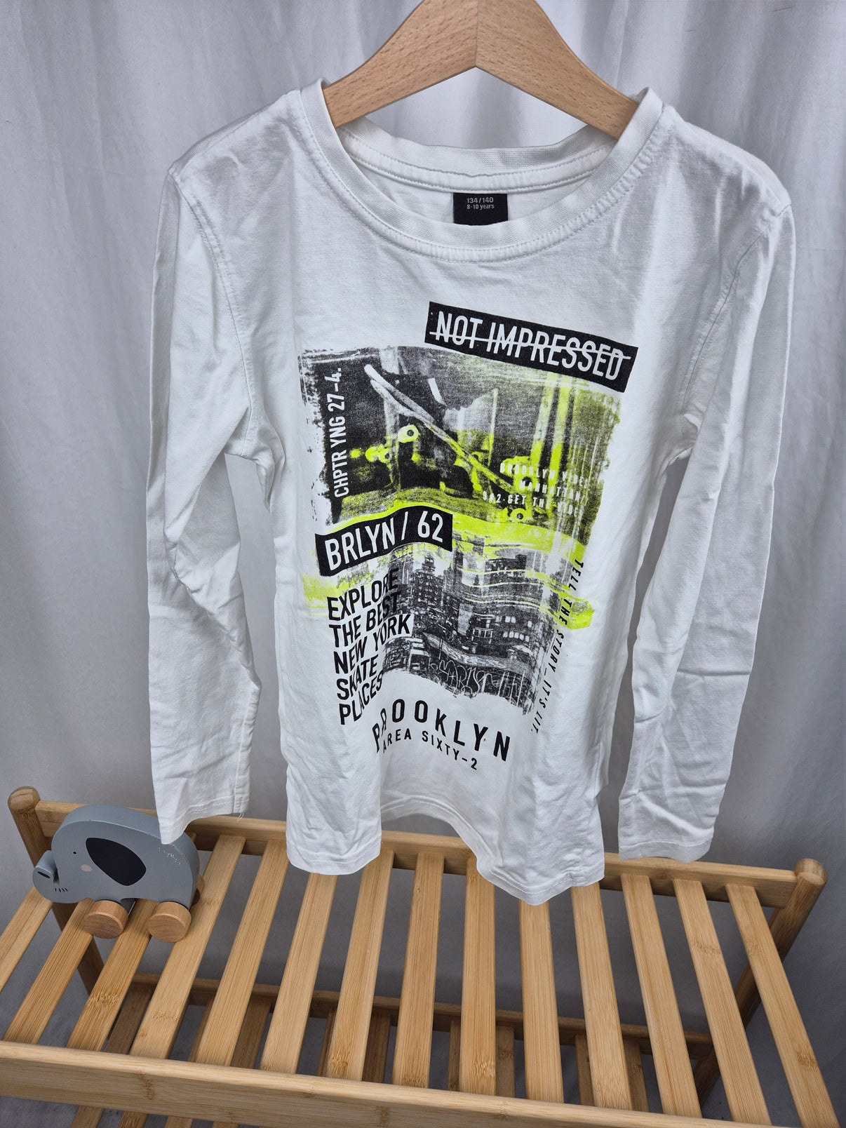 Moderní chlapecké tričko s dlouhým rukávem Takko ve světlé (bílé) barvě. Na přední straně má stylový potisk s motivem města Brooklyn / New York v kombinaci černé a neonově žluté barvy. Nápisy jako „NOT IMPRESSED“, „EXPLORE THE BIG NY SKATE PLACES“ dodávají tričku městský street styl. Vyrobeno z měkké bavlny, vhodné na běžné nošení i do školy.