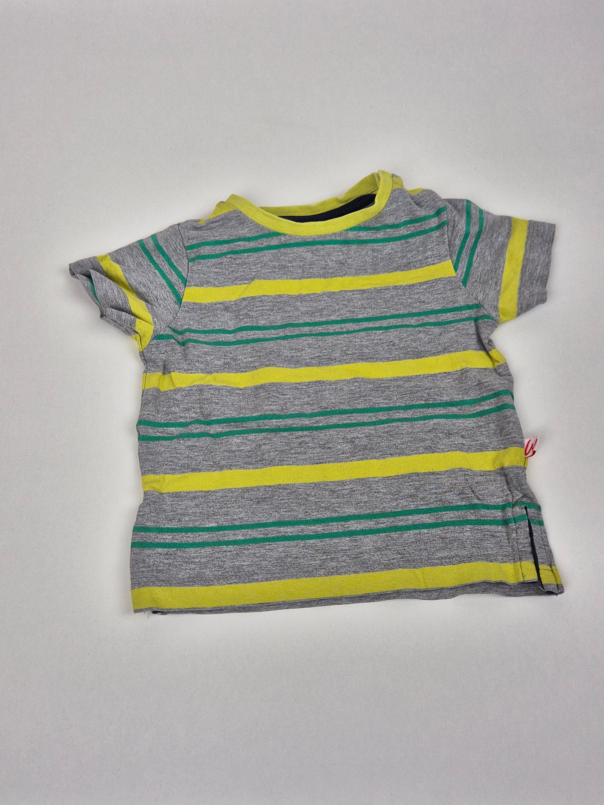 Lehké tričko Whoopi s krátkým rukávem v šedé barvě s barevnými pruhy – žlutými a zelenými. Vyrobeno z měkké a prodyšné bavlny, takže je ideální na léto nebo jako pohodlný kousek na doma. Má jednoduchý střih a příjemný materiál vhodný pro každodenní nošení.