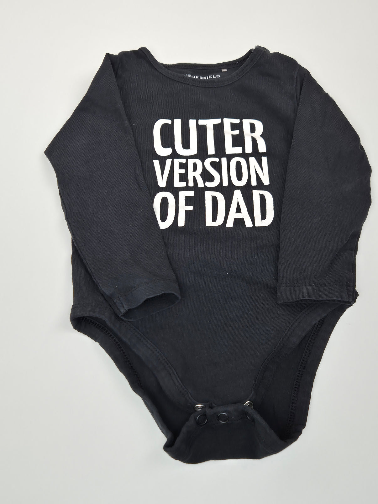 Stylové bavlněné body Fisherfield s dlouhým rukávem v černé barvě, které zaujme výrazným nápisem „CUTER VERSION OF DAD“. Působí moderně, minimalisticky a zároveň hravě. Měkký materiál je příjemný na celodenní nošení a praktické zapínání mezi nožičkami usnadňuje přebalování. Díky neutrální barvě a univerzálnímu motivu je skvělé pro holčičku i chlapečka.