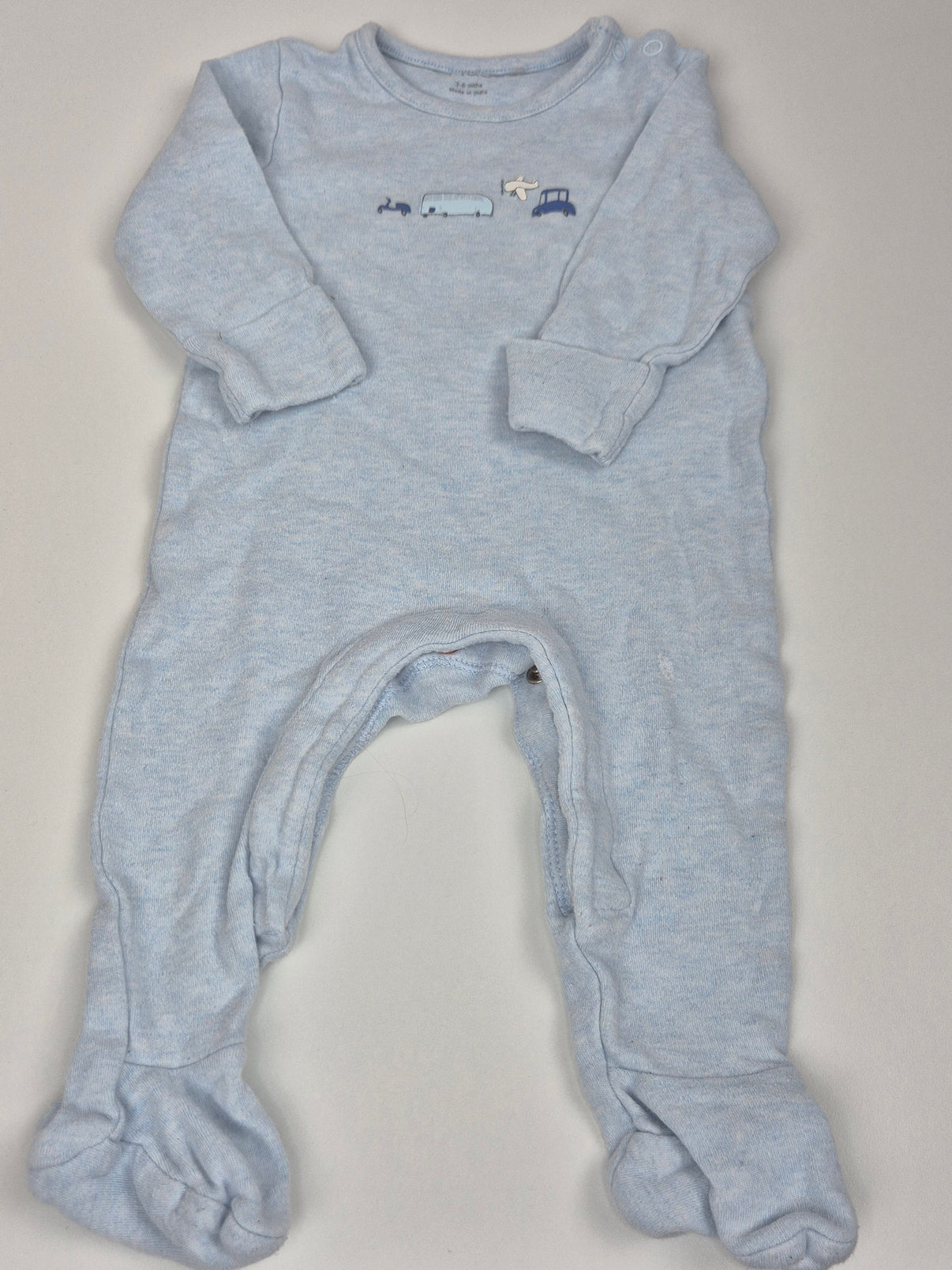 Měkké dupačky Marks&Spencer ve světle modré barvě s decentním potiskem autíček a letadýlka na hrudi. Integrované ťapky udrží nožičky v teple, zatímco praktické zapínání mezi nožičkami usnadní přebalování. Jemný materiál zajistí pohodlí při spánku i každodenním nošení. Vhodné pro chlapečky.