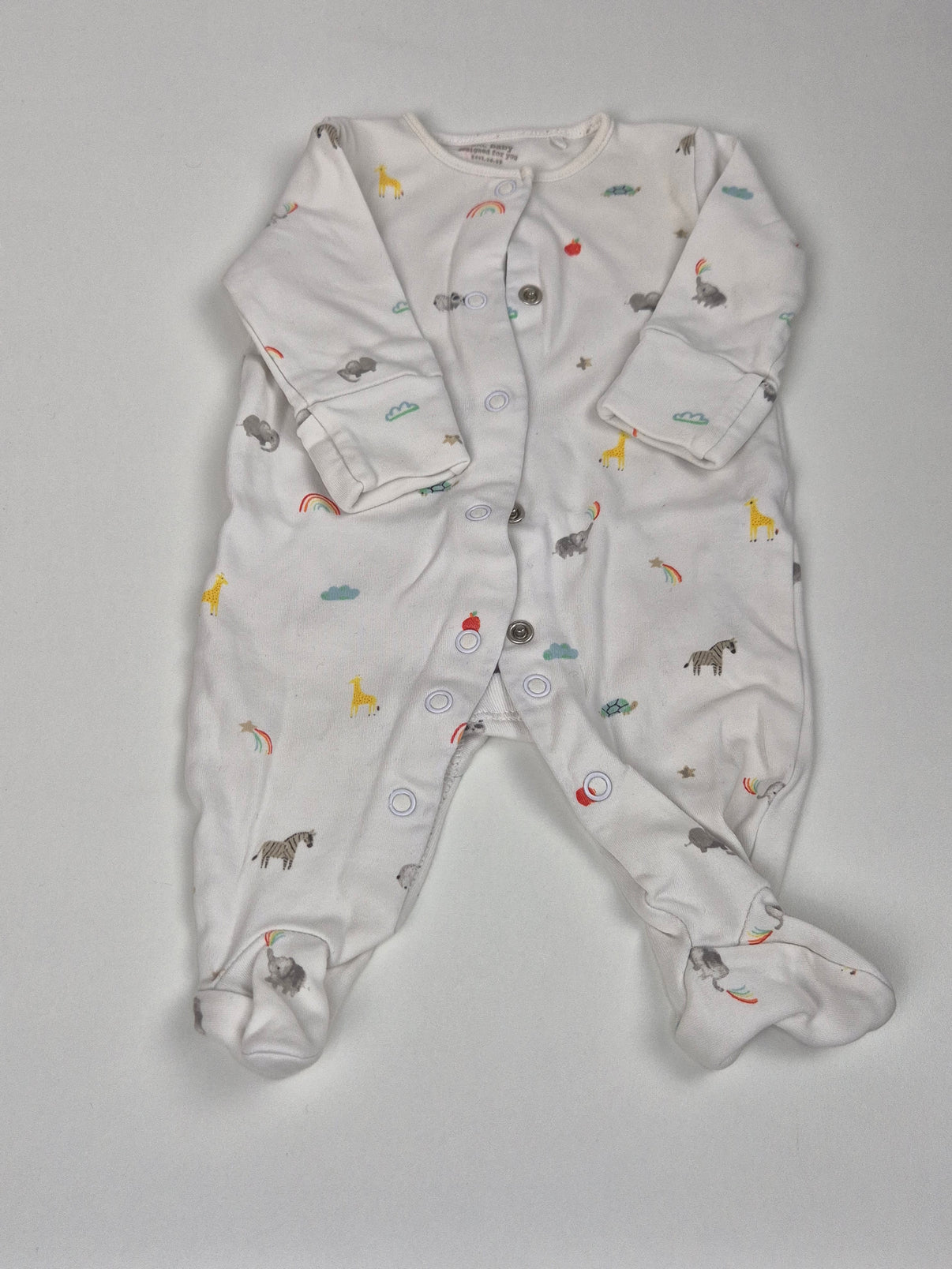 Roztomilé dupačky Next v bílé barvě se zapínáním na patentky po celé délce. Barevný potisk zvířátek, duhy a obláčků dodává hravý vzhled. Integrované ťapky udrží nožičky v teple a měkký bavlněný materiál zajistí pohodlí po celý den i noc. Vhodné pro holčičky i chlapečky.