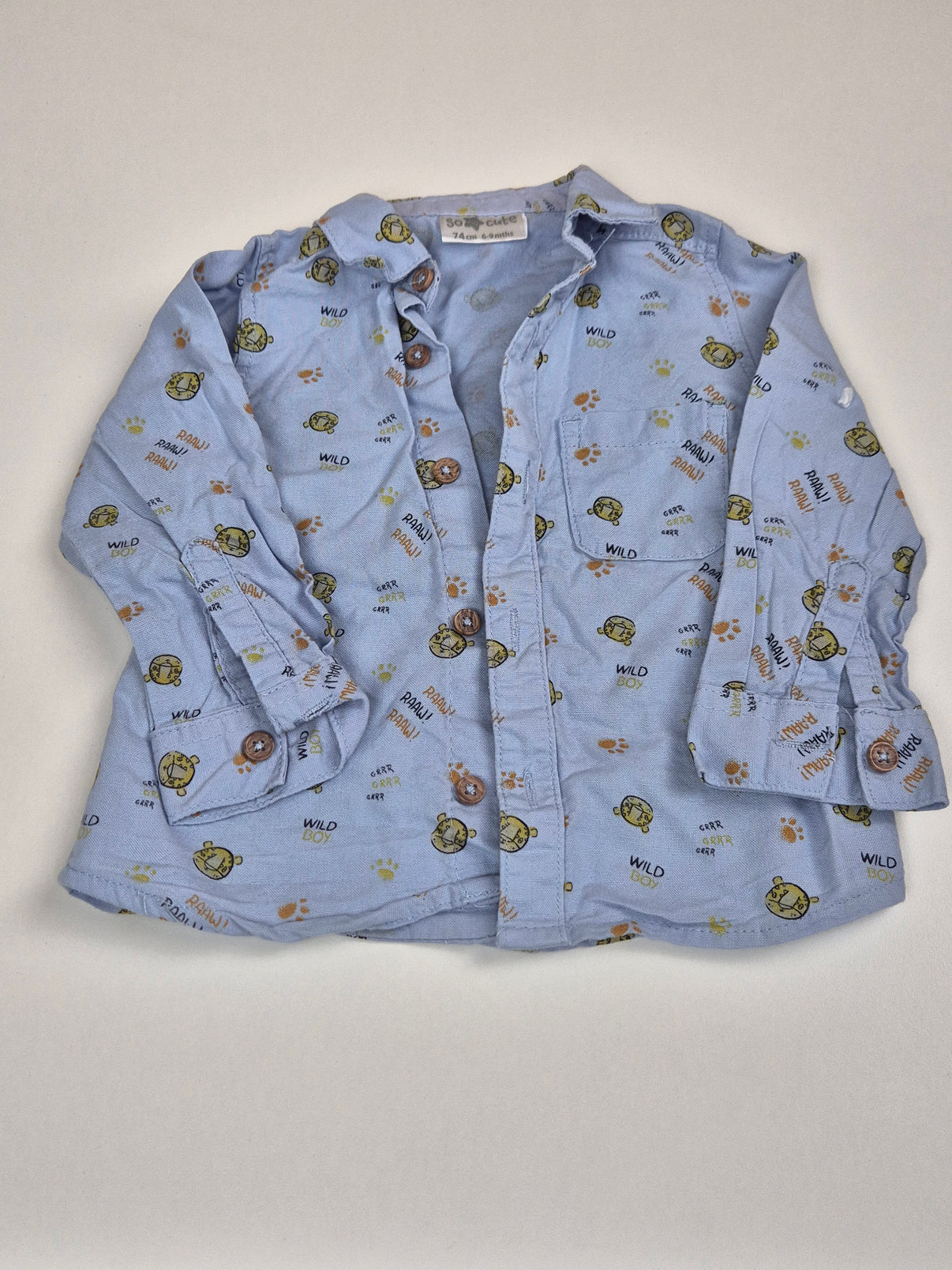 Roztomilá chlapecká košile Pepco ve velikosti 74 v jemném světle modrém odstínu, zdobená hravým potiskem lvíčků, stop, nápisů a malých motivů džungle. Lehký bavlněný materiál je příjemný na nošení a ideální na běžné dny, oslavy i focení. Košile má klasický límeček, přední kapsičku a zapínání na knoflíčky – snadno se obléká a vypadá skvěle i rozepnutá přes tričko. Perfektní kousek pro malé „wild boys“.