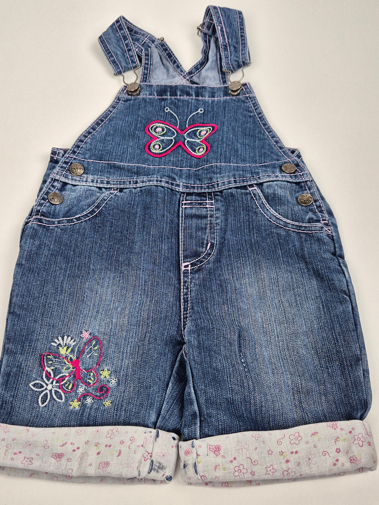 Roztomilé dívčí laclové kraťasy značky Dopodopo, velikost 80, z klasické modré džínoviny. Na přední straně zdobené barevnou výšivkou motýlků a na laclu dalším motýlkem s růžovým lemováním. Nohavice lze nosit ohrnuté, uvnitř je podšívka s jemným květinovým vzorem. Praktické zapínání na bokách a nastavitelné ramínka zajistí pohodlné nošení.