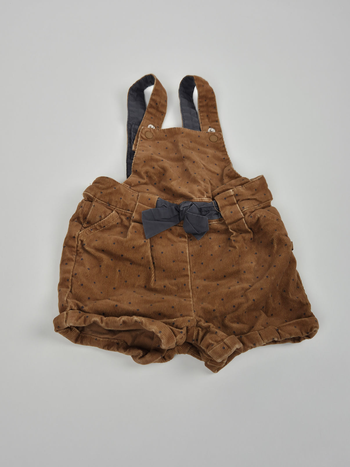 Stylové manšestrové laclové kraťásky značky Obaibi ve velikosti 68. Hnědý podklad zdobí drobné puntíky a v pase je dekorativní šedá mašle, která dodává kraťáskům jemně elegantní vzhled. Praktické zapínání na patentky na ramínkách a elastický pas vzadu usnadňují oblékání. Ideální kousek pro malé holčičky na letní dny i slavnostnější příležitosti.