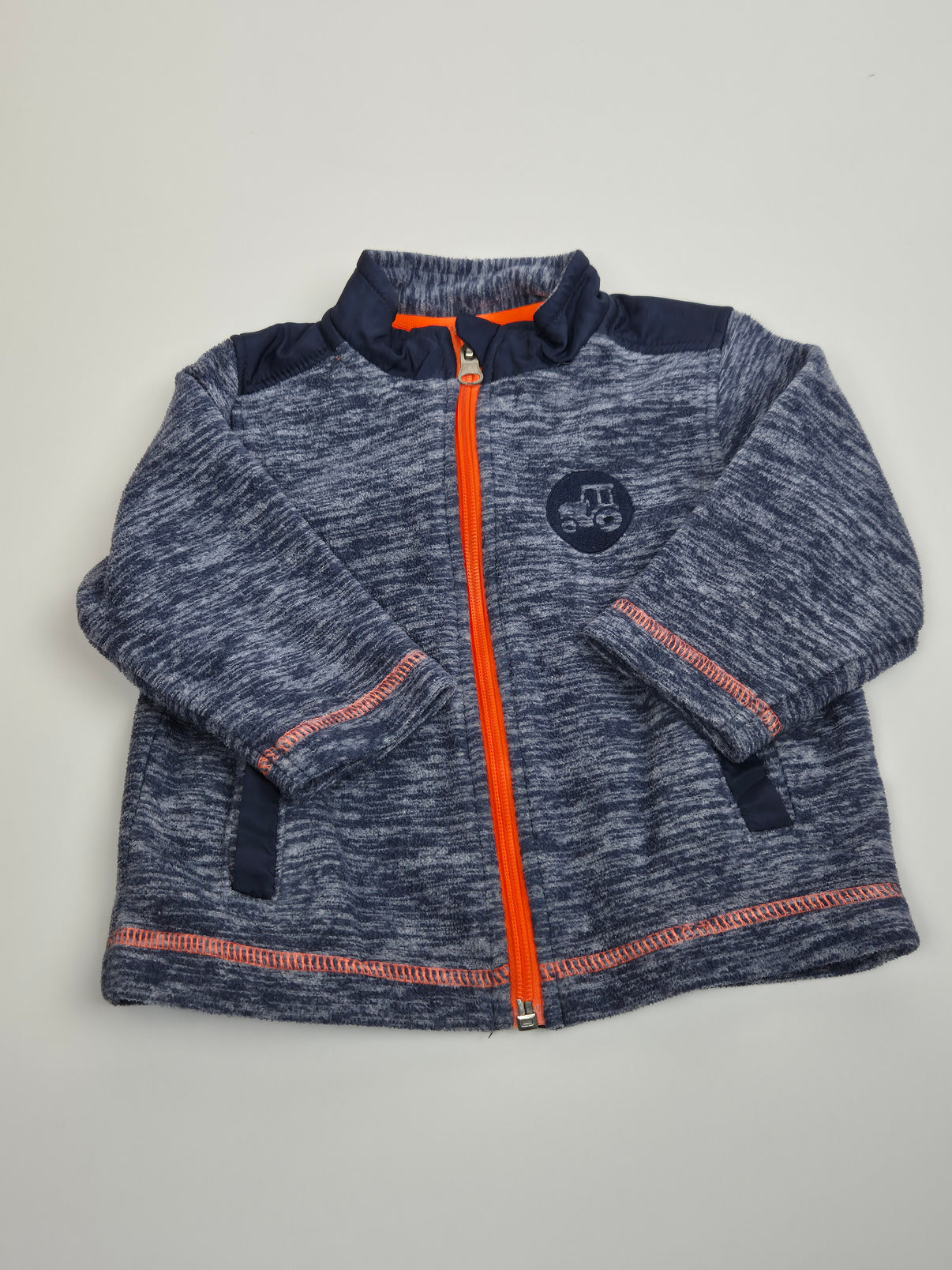 Sportovně laděná dětská mikina značky Topomini v tmavě modrém melírovaném odstínu s výraznými oranžovými detaily. Kontrastní zip po celé délce, ozdobné prošití a malé nášivky na rukávech i hrudi dodávají mikině moderní a hravý vzhled. Barevná kombinace tmavě modré a oranžové působí energicky a je typicky klučičí.