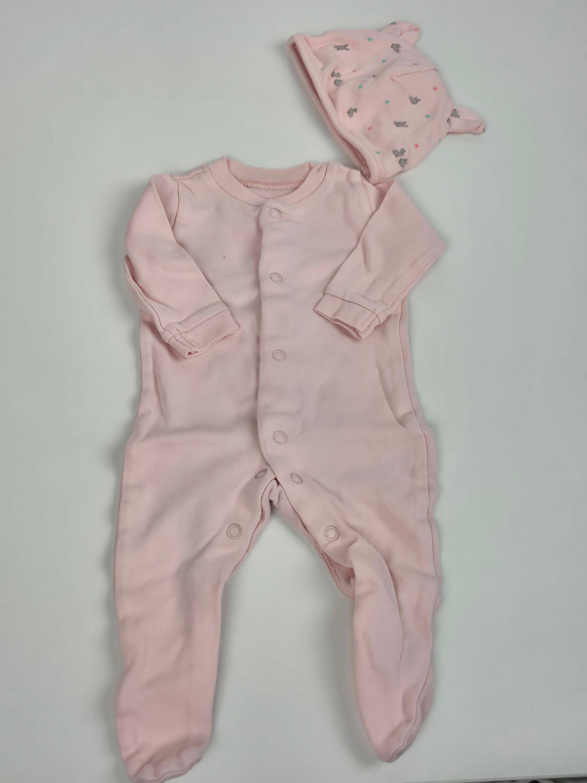Roztomilý set dupaček a čepice F&F ve velikosti 62. Světle růžové dupačky na patentky a měkká čepička s oušky a potiskem. Pohodlné na doma i na spaní.