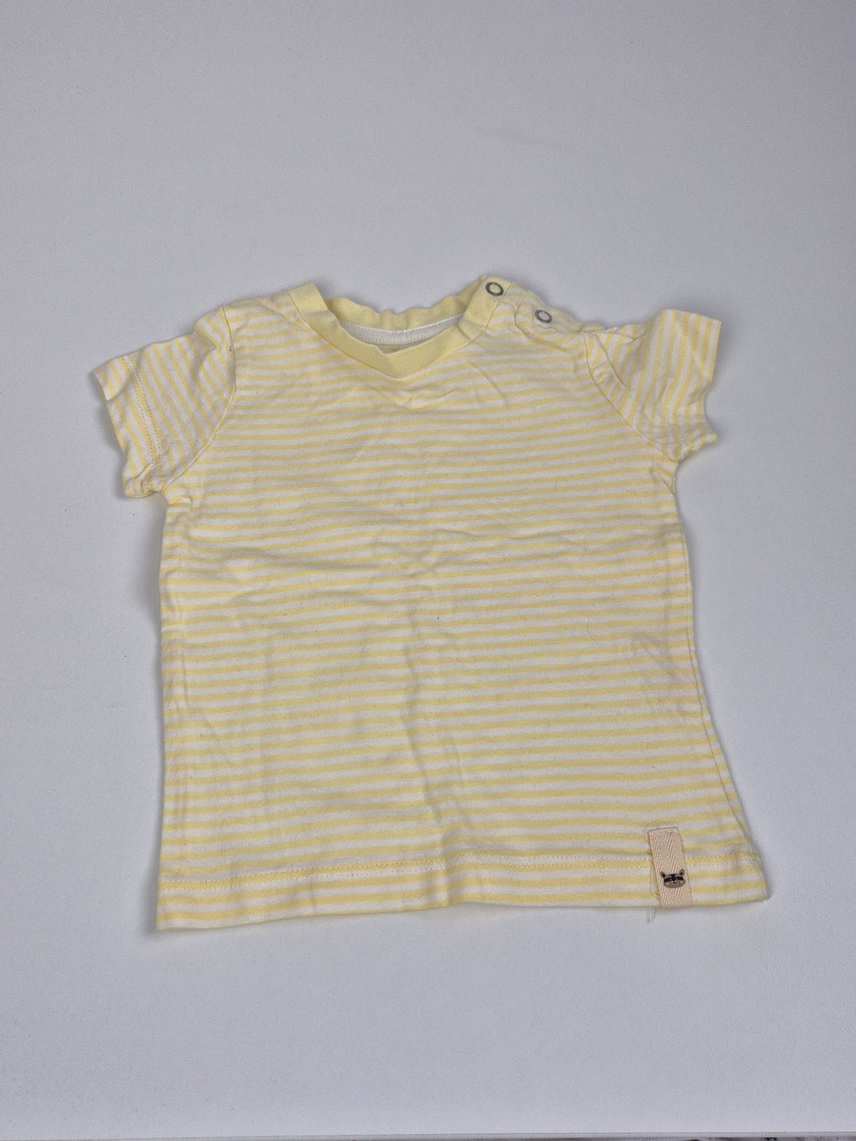 Roztomilé dětské tričko značky Kuniboo ve velikosti 62/68. Žlutobílé proužky působí svěže a hravě, zapínání na patentky u ramínka usnadní oblékání. Pohodlný kousek z lehké bavlny, ideální na každodenní nošení.
