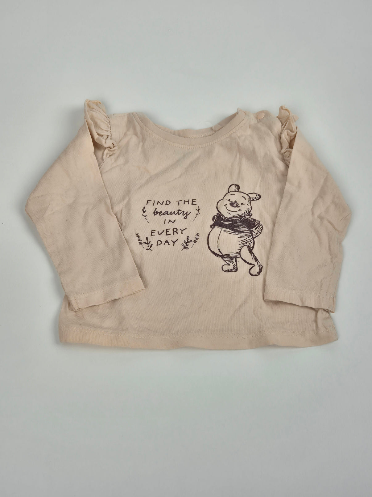 Krémové tričko Sinsay s dlouhým rukávem a potiskem oblíbeného Medvídka Pú. Na přední straně je motiv Púa s nápisem „Find the beauty in every day“, doplněný jemnými volánky na ramenou, které dodávají tričku roztomilý vzhled. Vyrobeno z měkké bavlny, ideální na každodenní nošení. Velikost 74, vhodné pro holčičky.